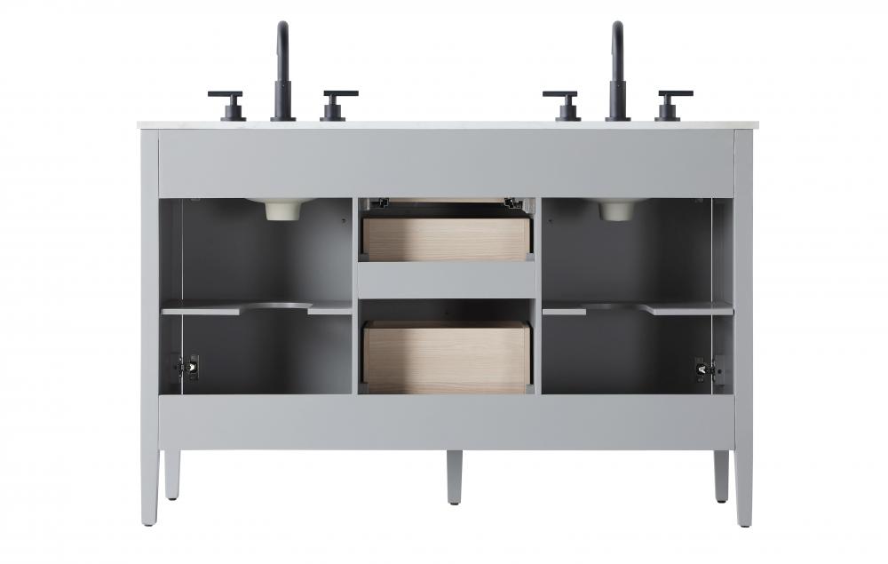 Inside the cabinet, the shelf is thoughtfully designed with a U-shaped cutout to allow for seamless plumbing installation while maintaining storage space.