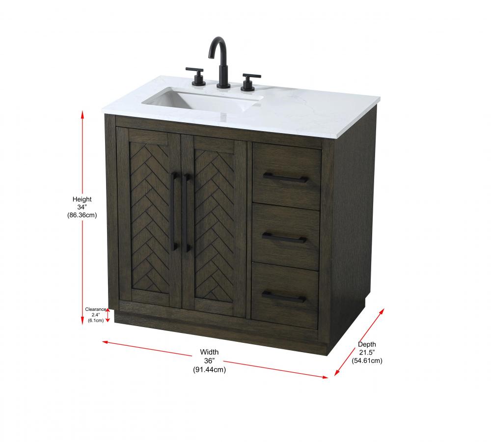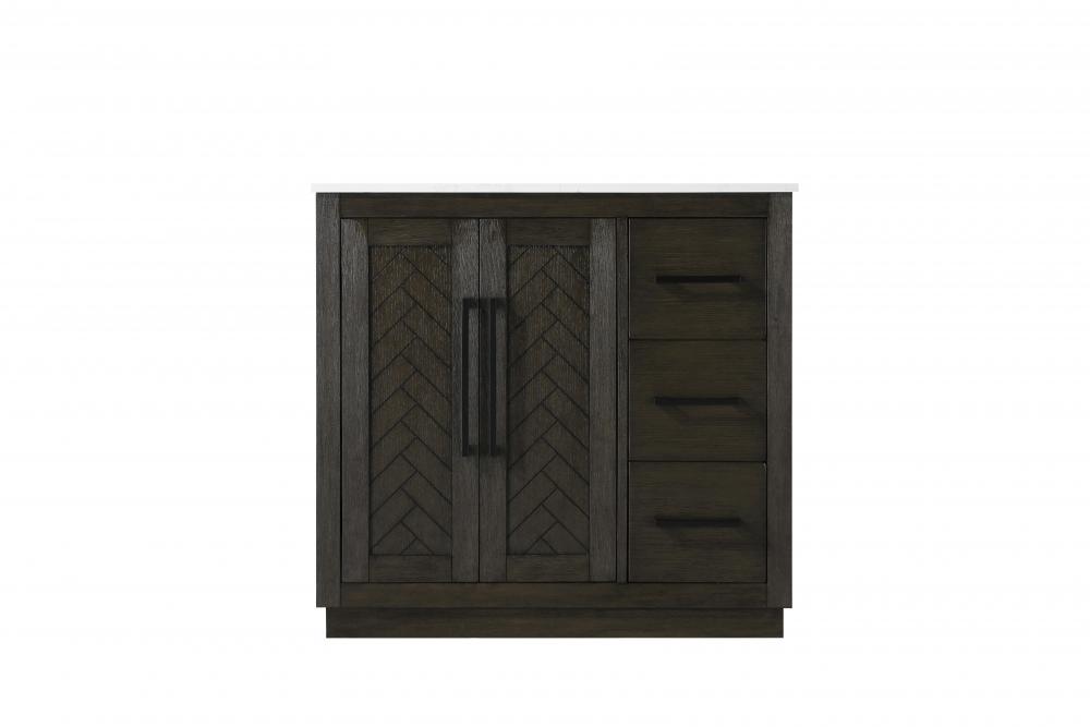 This transitional bathroom vanity offers the perfect blend of timeless style and modern functionality. Available in five refined finishes—crisp white, sleek grey, chocolate oak, honey oak, and linen oak—it complements a range of decor styles, from classic to contemporary. The stunning herringbone design on the Shaker-style door panels adds texture and craftsmanship to the piece. Topped with a white engineered marble countertop featuring subtle veining, it provides both beauty and durability. The long black metal pulls on the soft-closing doors and the thin bar pulls on the drawers add sleek, modern detailing. Practical features include a concealed overflow, a back panel cutout for easy plumbing installation, and a U-shaped cutout shelf to fit plumbing while maximizing storage space. with a toe kick all around the base, this vanity is thoughtfully designed to blend form and function in any bathroom setting.