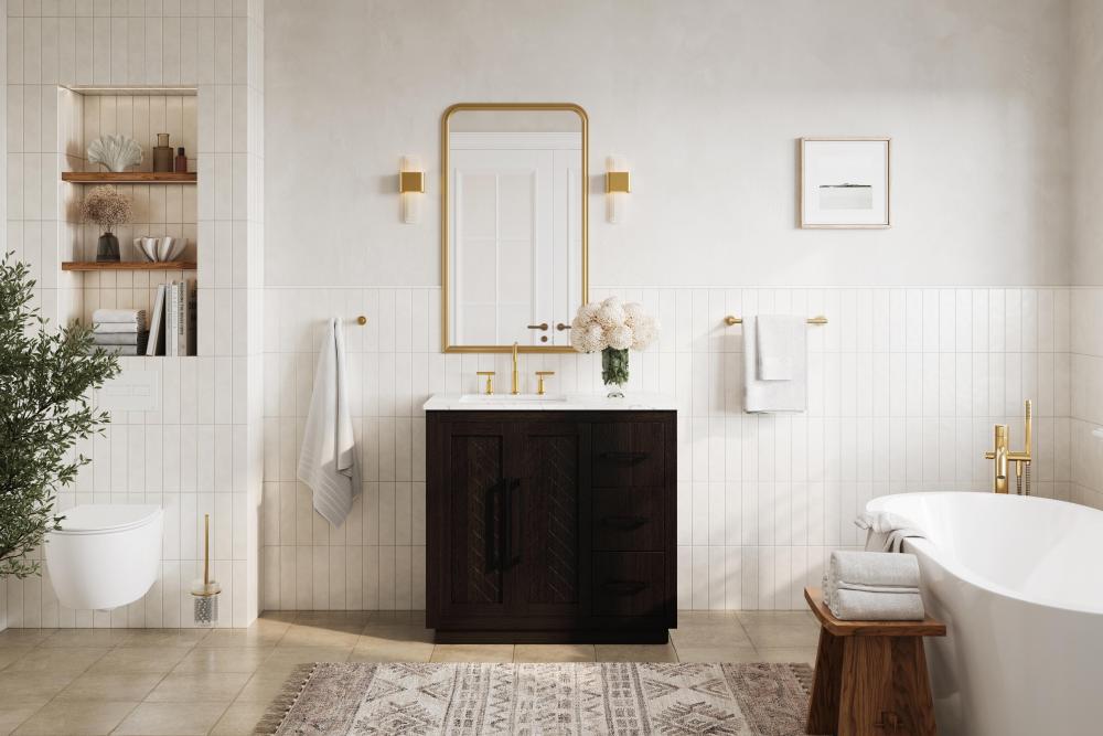 This transitional bathroom vanity comes in five elegant finishes to suit a variety of styles: Crisp White for a clean, timeless look, Sleek Grey for modern sophistication, Chocolate Oak (dark brown) for a rich.