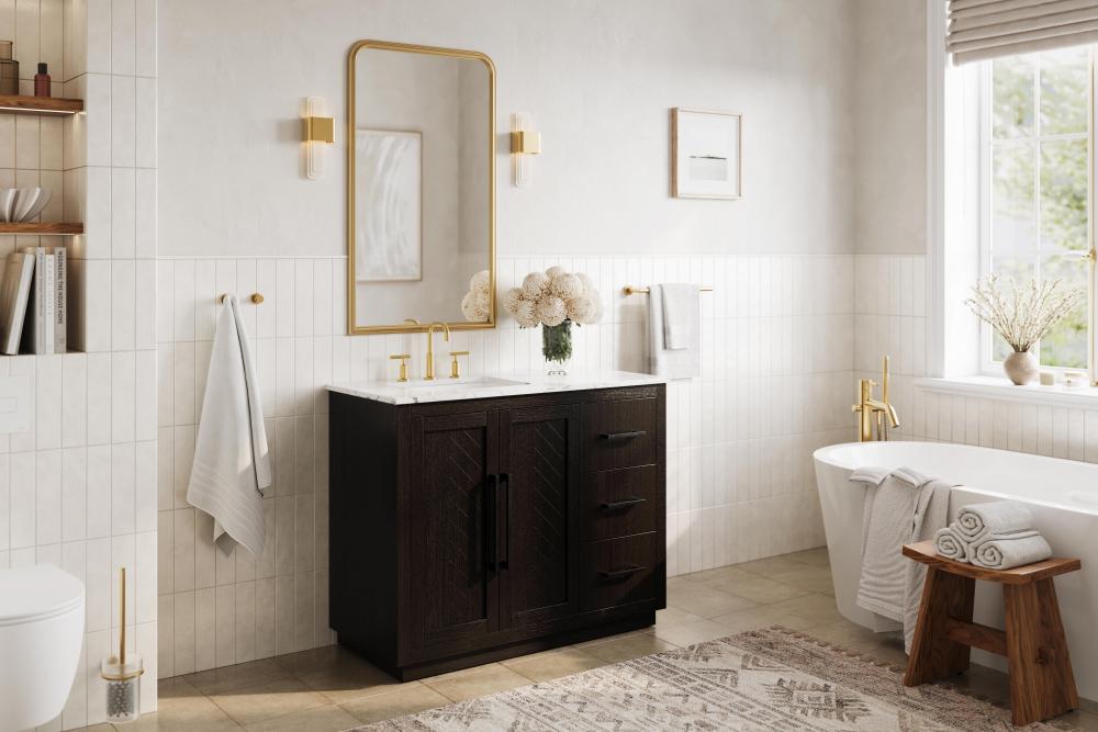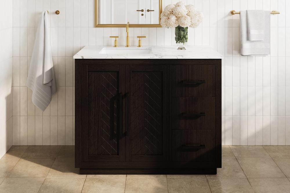 Each finish enhances the unique herringbone design on the Shaker-style door panels, adding a touch of craftsmanship and texture that elevates the overall design of the vanity.