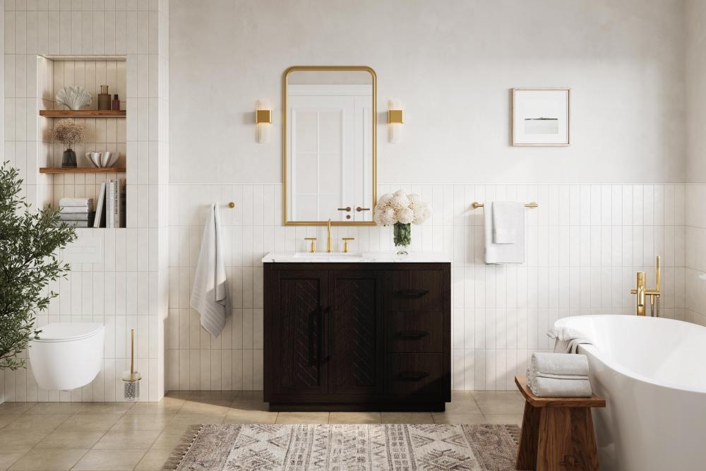 The vanity includes a concealed overflow, keeping the design sleek and uninterrupted, while ensuring practical overflow protection.