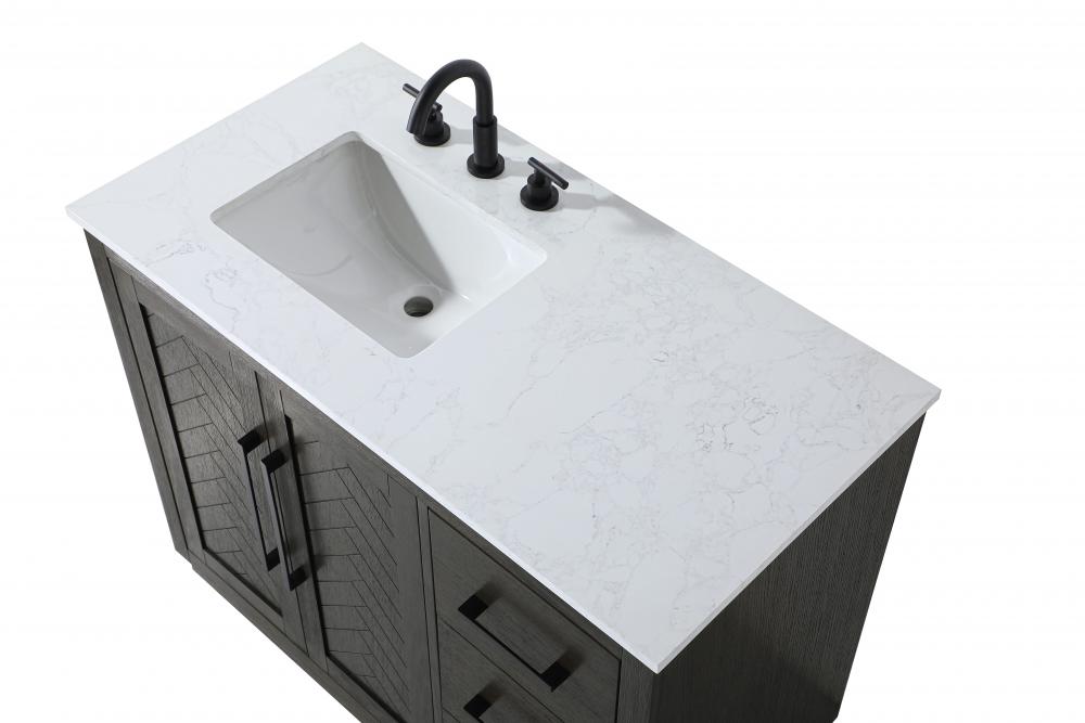 This transitional bathroom vanity offers the perfect blend of timeless style and modern functionality. Available in five refined finishes—crisp white, sleek grey, chocolate oak, honey oak, and linen oak—it complements a range of decor styles, from classic to contemporary. The stunning herringbone design on the Shaker-style door panels adds texture and craftsmanship to the piece. Topped with a white engineered marble countertop featuring subtle veining, it provides both beauty and durability. The long black metal pulls on the soft-closing doors and the thin bar pulls on the drawers add sleek, modern detailing. Practical features include a concealed overflow, a back panel cutout for easy plumbing installation, and a U-shaped cutout shelf to fit plumbing while maximizing storage space. with a toe kick all around the base, this vanity is thoughtfully designed to blend form and function in any bathroom setting.