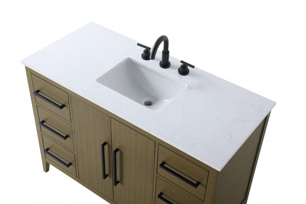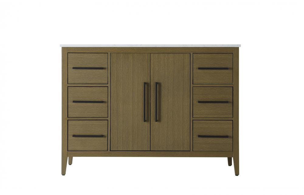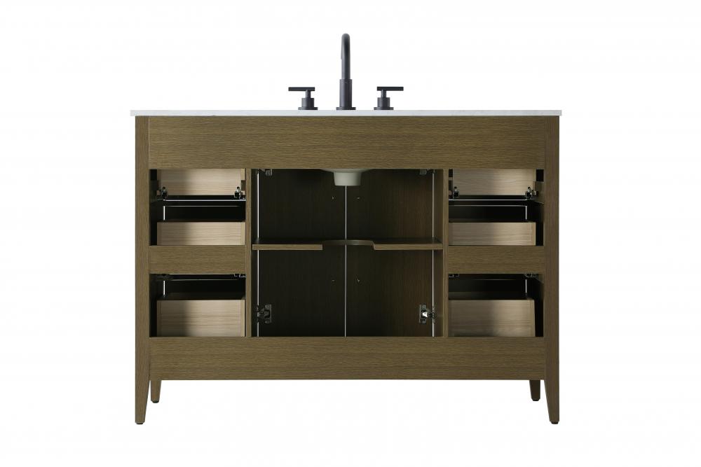 Bring both elegance and practicality to your bathroom with this transitional vanity, available in a selection of rich finishes that highlight the beauty of faux wood grain in shades of mocha, chestnut, and honey, along with classic white and modern grey. The flat door panels and sleek black metal pulls create a minimalist yet refined aesthetic, while the soft-closing drawers and tapered legs with levelers provide smooth, functional operation. Topped with a luxurious white engineered marble countertop and featuring a porcelain sink, this vanity combines timeless style with modern efficiency. Thoughtfully designed with U-shaped cutout for plumbing, it offers ample storage and easy installation, making it the perfect centerpiece for any bathroom.