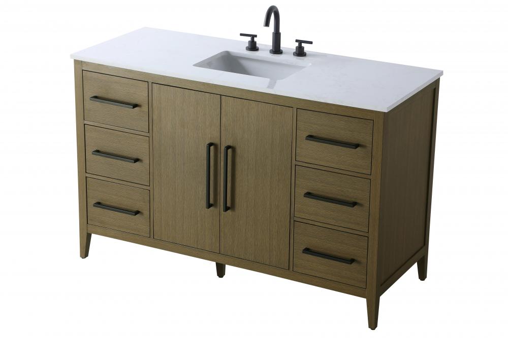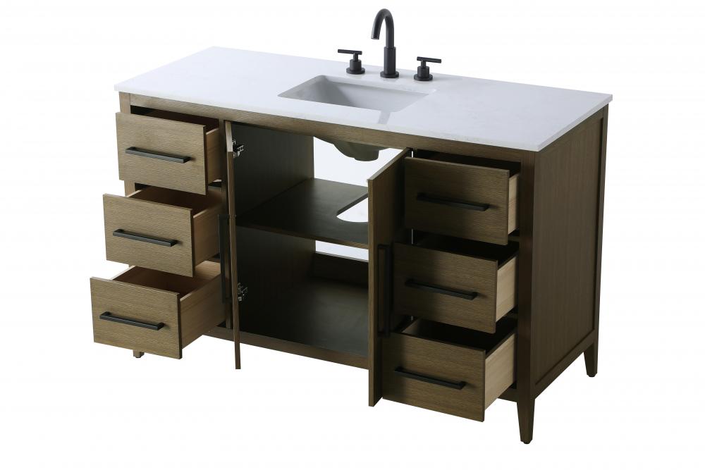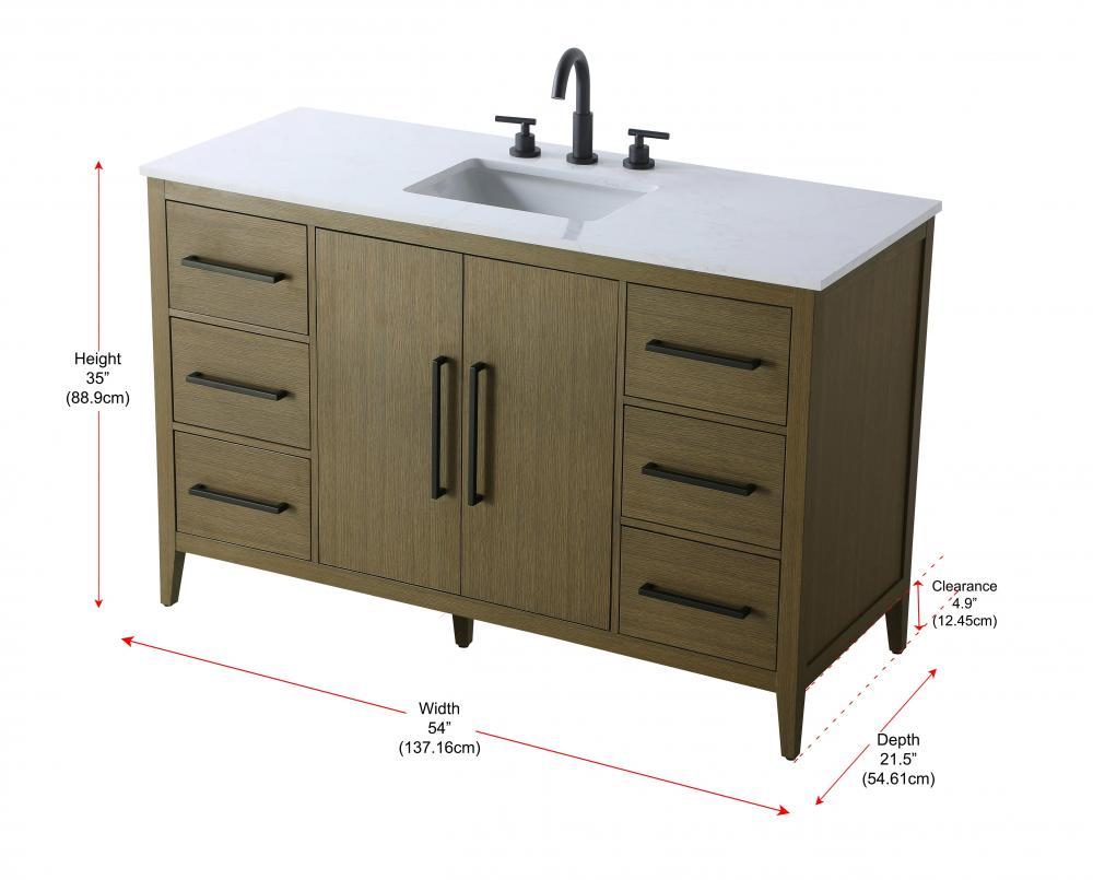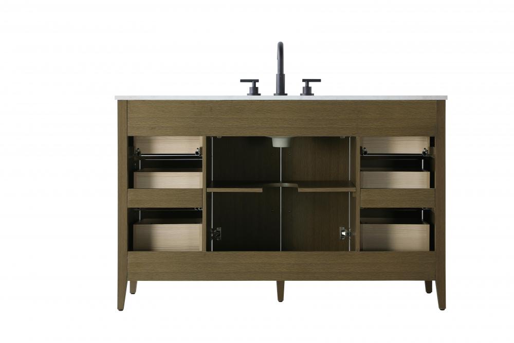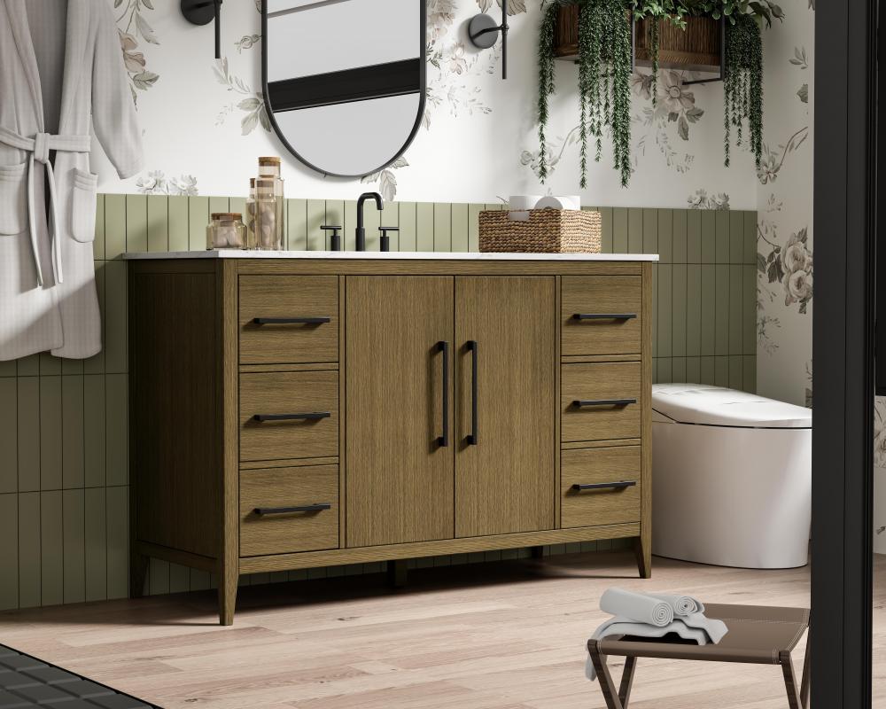 The vanity stands on tapered 5-inch solid wood legs with levelers for a balanced, polished look, combining modern style with practicality.