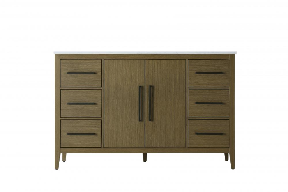 Bring both elegance and practicality to your bathroom with this transitional vanity, available in a selection of rich finishes that highlight the beauty of faux wood grain in shades of mocha, chestnut, and honey, along with classic white and modern grey. The flat door panels and sleek black metal pulls create a minimalist yet refined aesthetic, while the soft-closing drawers and tapered legs with levelers provide smooth, functional operation. Topped with a luxurious white engineered marble countertop and featuring a porcelain sink, this vanity combines timeless style with modern efficiency. Thoughtfully designed with U-shaped cutout for plumbing, it offers ample storage and easy installation, making it the perfect centerpiece for any bathroom.