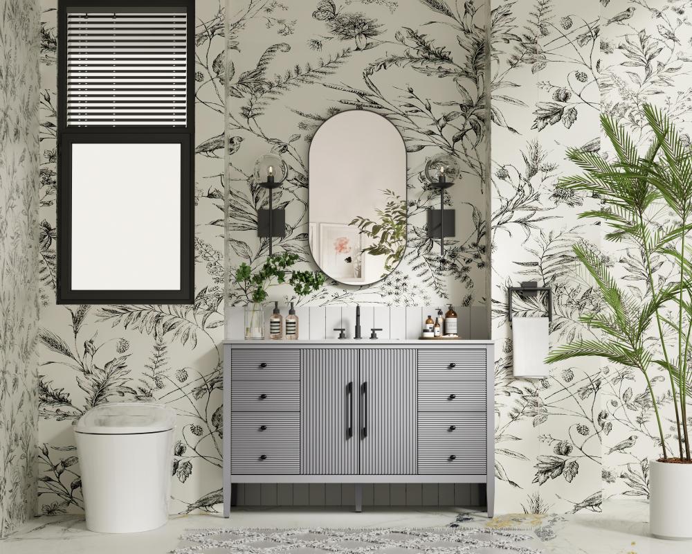 The slender black metal pulls on the doors and the oval-shaped knobs on the drawers provide sleek, modern accents, enhancing the vanity's elegant design.