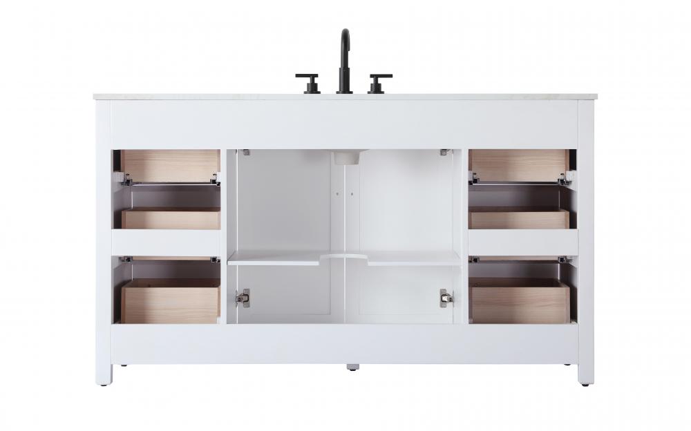 The slender black metal handle pulls on the doors and drawers offer a sleek, modern contrast to the white finish, adding to the vanity's sophisticated look.