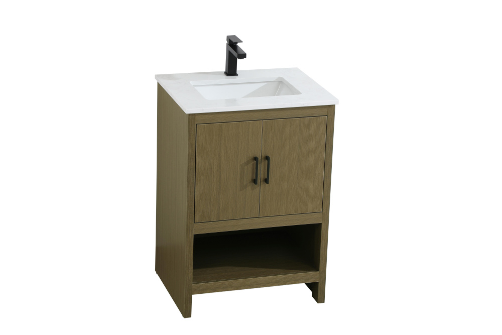 Bring modern style and practicality to your bathroom with this sleek vanity, designed to complement contemporary spaces. The flat-panel doors create a clean, minimalist look, while the open bottom shelf provides functional storage or a space to display decorative items. The engineered marble countertop showcases unique faux marbling, adding a refined and distinct touch to the design. The durable porcelain sink is easy to maintain, and the single pre-drilled faucet hole simplifies the installation process. Constructed from high-quality MDF with a versatile woodgrain finish, this vanity combines durability with timeless style. With adjustable foot levelers for stability on uneven floors and a fully assembled design, this piece offers a seamless addition to your bathroom.