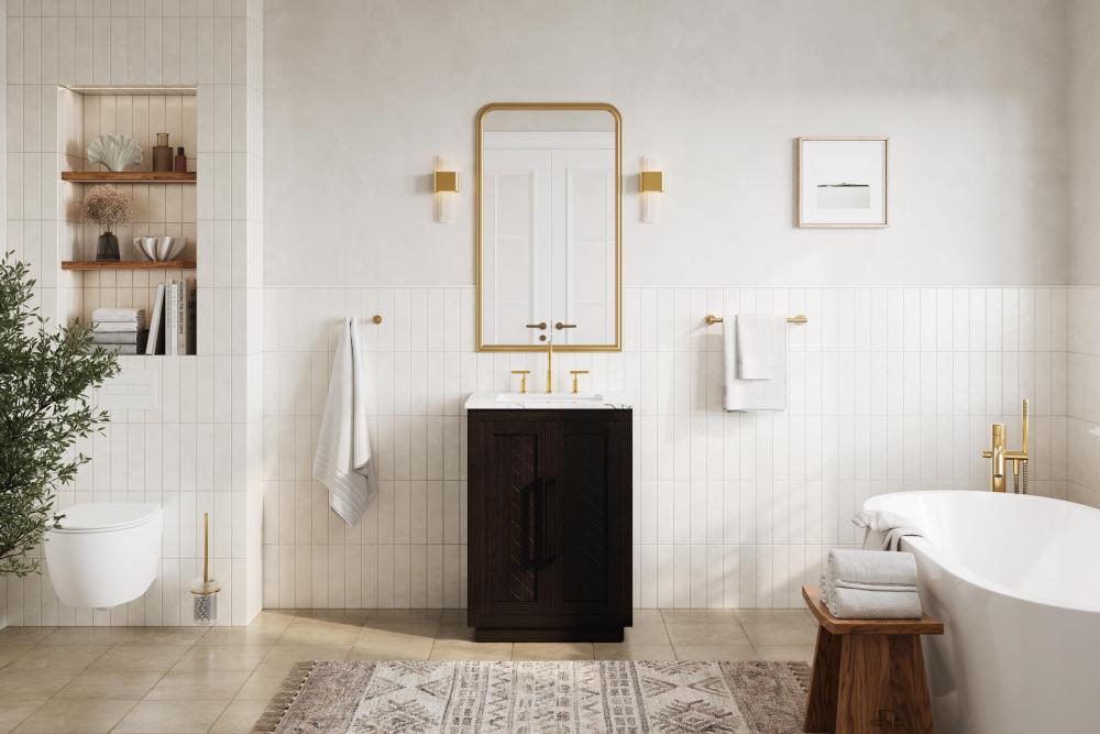 Each finish enhances the unique herringbone design on the Shaker-style door panels, adding a touch of craftsmanship and texture that elevates the overall design of the vanity.