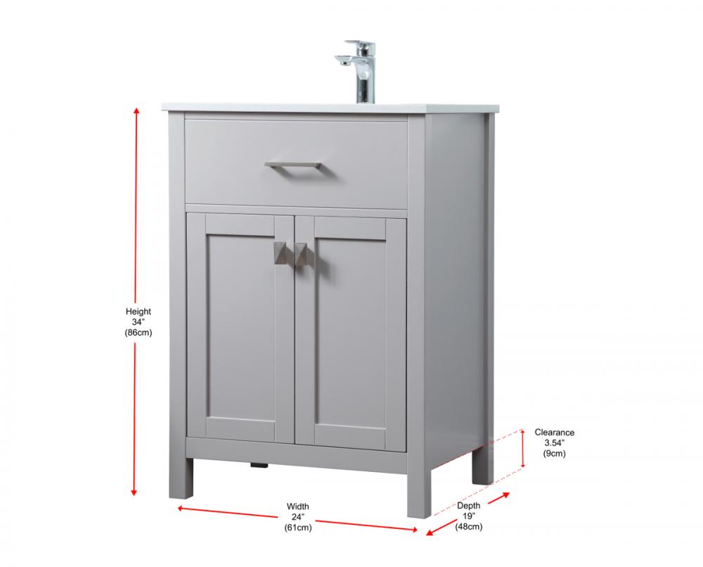 Elevate your bathroom aesthetic with our precision-crafted 24-inch vanity, featuring a chic straight edge cut and an engineered marble top that infuses a dash of modern elegance into your space. Designed for seamless access and ample storage, the vanity showcases a single functional cabinet with two soft close doors, paired with a faux top drawer. The sophisticated undermount porcelain sink seamlessly merges style with practicality, while the inclusion of stylish hardware adds a personalized touch and ensures convenient access to storage. Boasting a lower open shelf for additional storage, this vanity seamlessly blends functionality with style, providing a practical area for decor or essentials. Complete with a single pre-drilled hole for seamless faucet installation, our versatile vanity allows you to effortlessly personalize your bathroom, adding a final touch of elegance to your unique space. Redefine your bathroom experience with this stylish and functional addition.