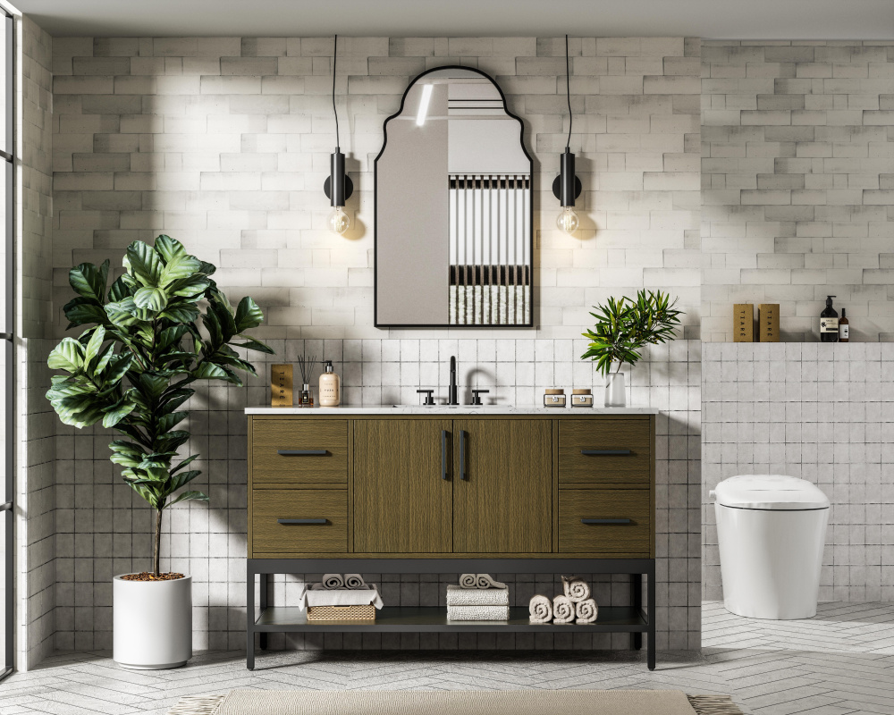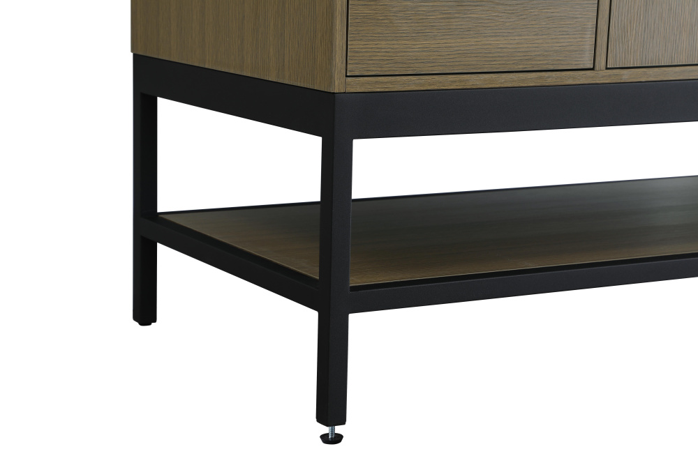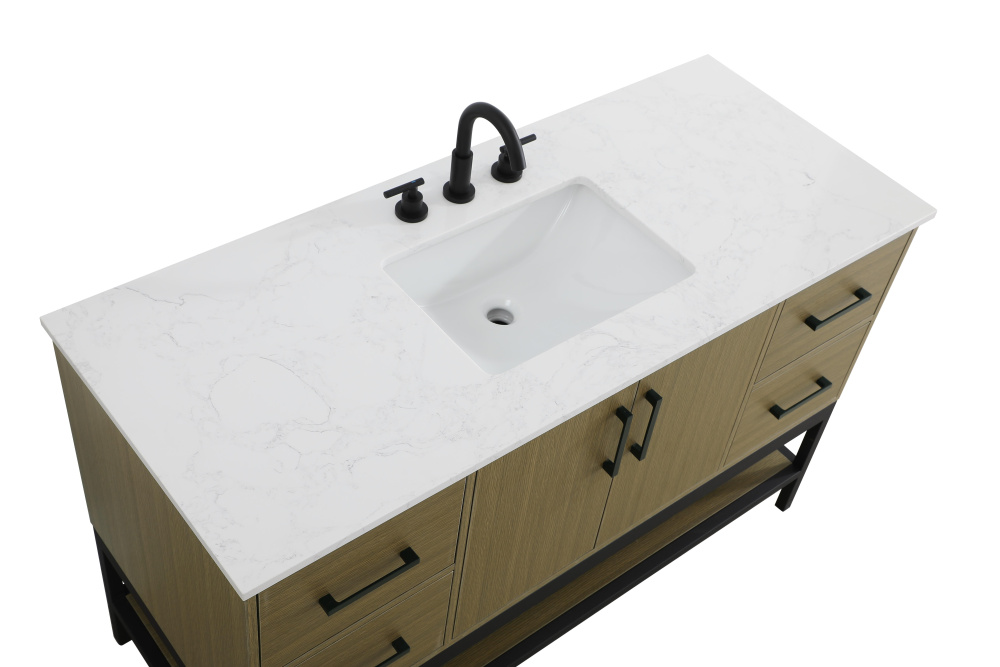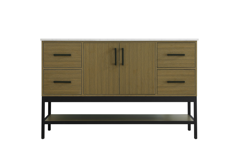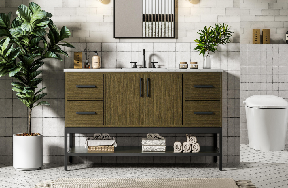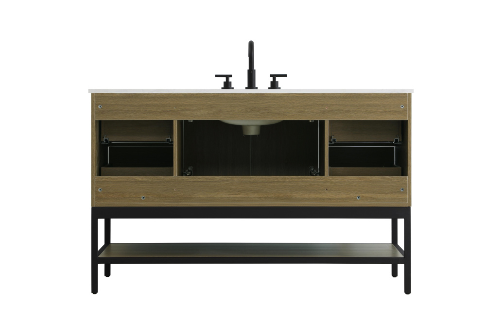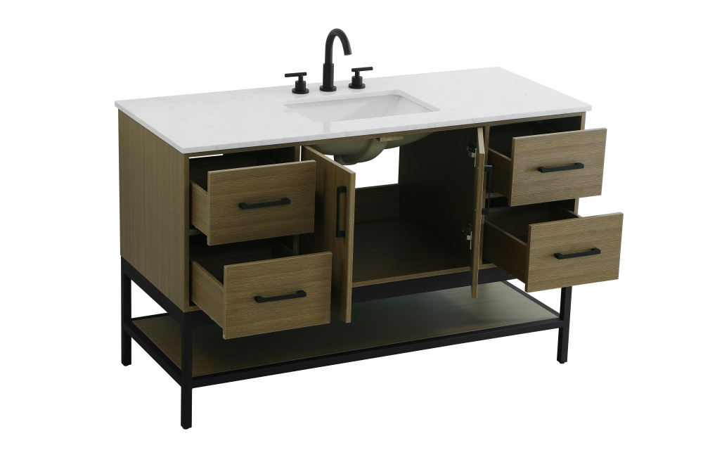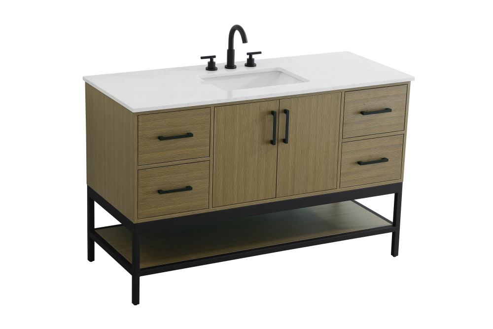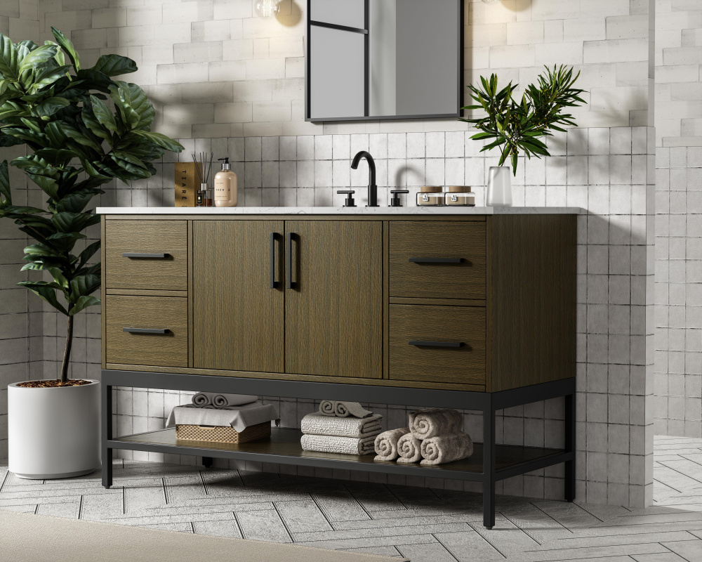 Upgrade your bathroom with this modern bathroom vanity that combines form and function effortlessly. Its sleek wood veneer cabinetry, paired with a bold black metal frame, brings a clean, contemporary vibe to any space. Designed with practicality in mind, this vanity offers soft-close drawers and cabinets to organize your essentials, as well as an open lower shelf for added storage or display. The durable white quartz countertop is built to withstand daily use, while the undermount ceramic sink ensures easy maintenance. Complete with matte black hardware and pre-drilled features for effortless installation, this vanity is the perfect centerpiece to refresh your bathroom with style and efficiency.