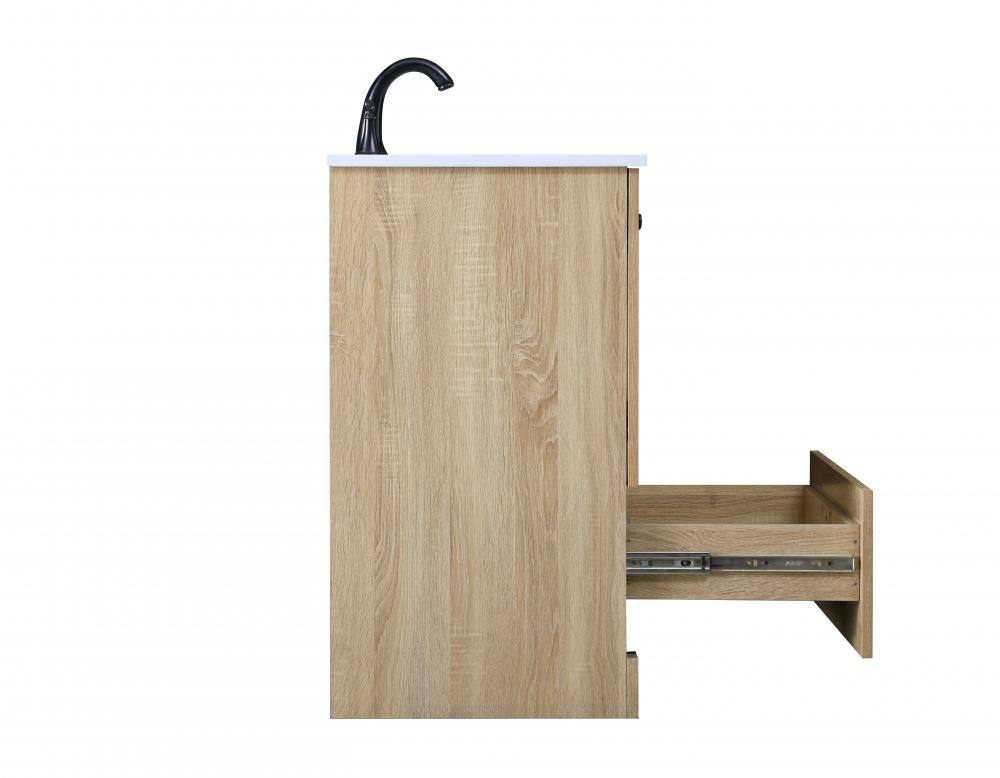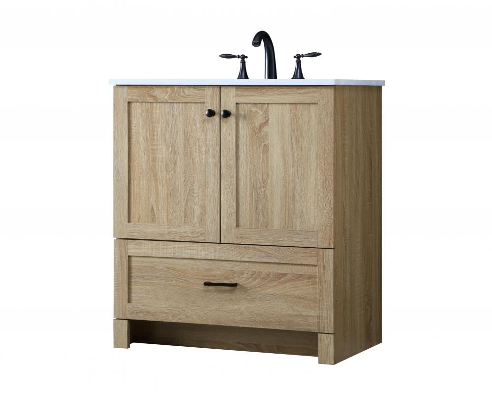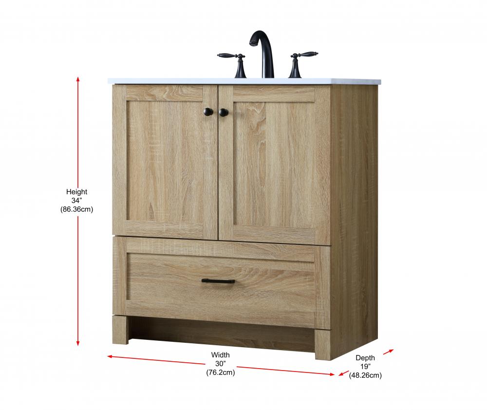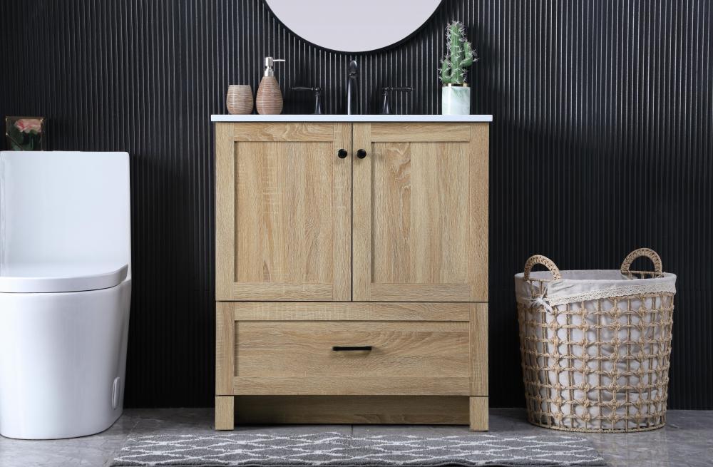 Revel in the beauty of a vanity that mimics the charm of real wood without the maintenance, boasting a faux wood look that adds a touch of natural warmth and rustic sophistication to your bathroom.