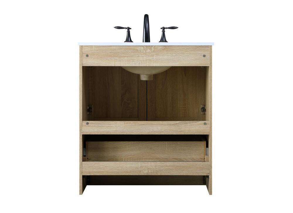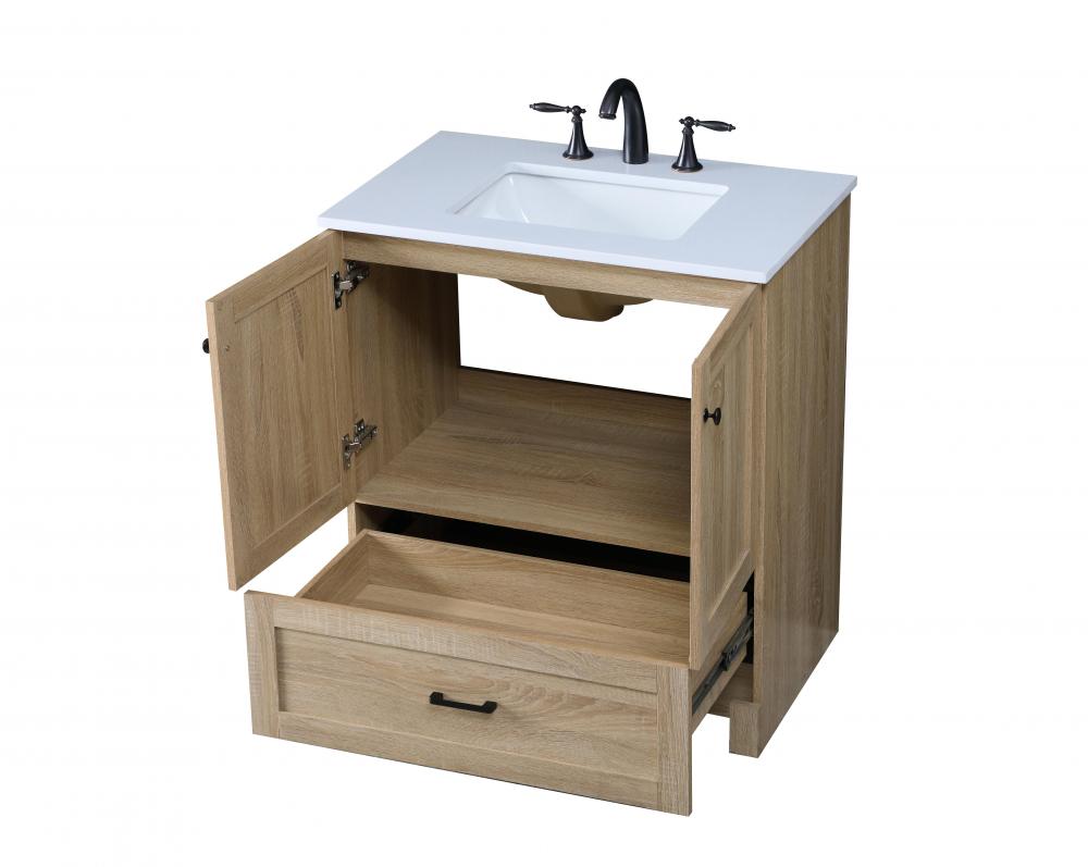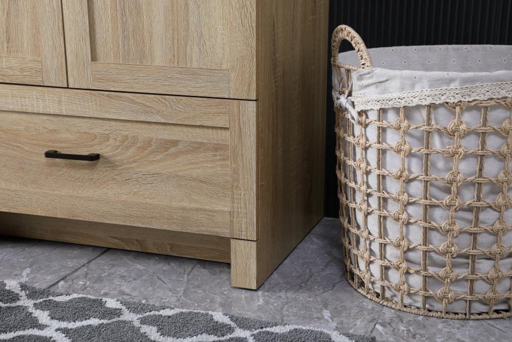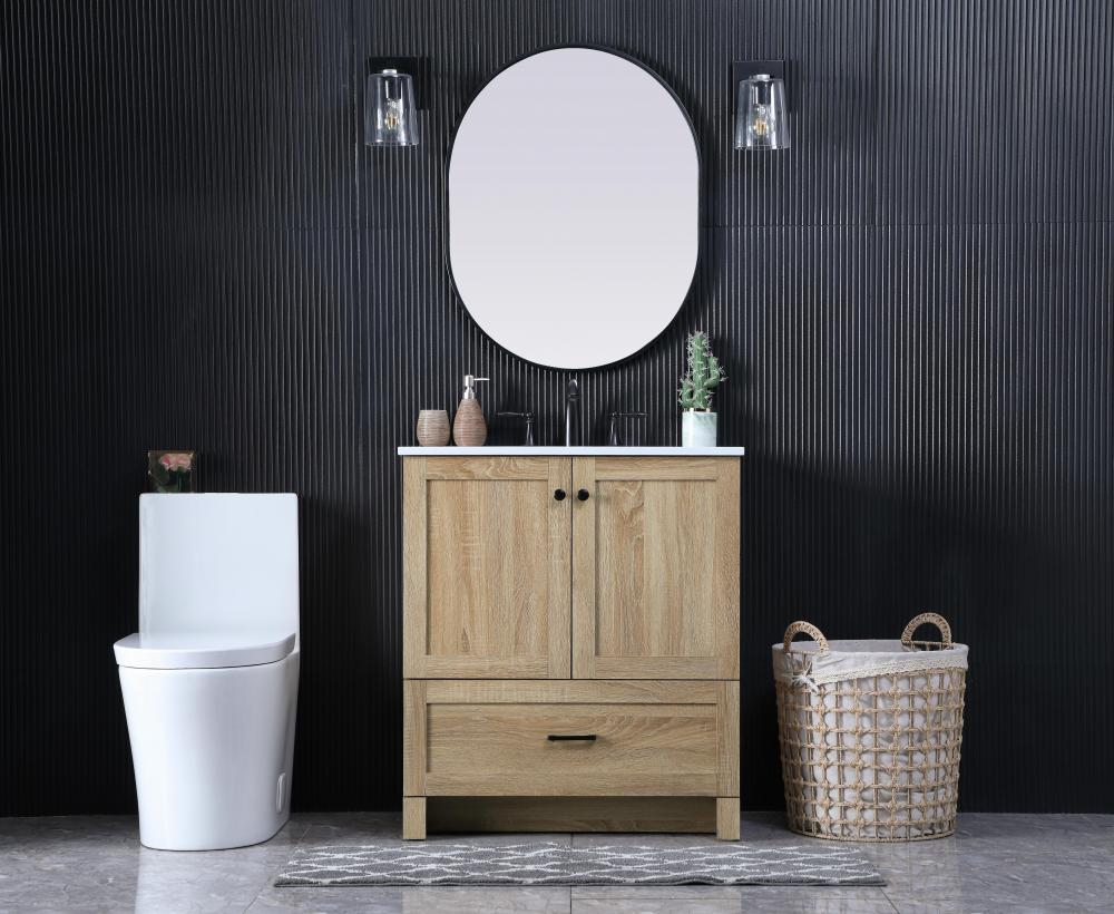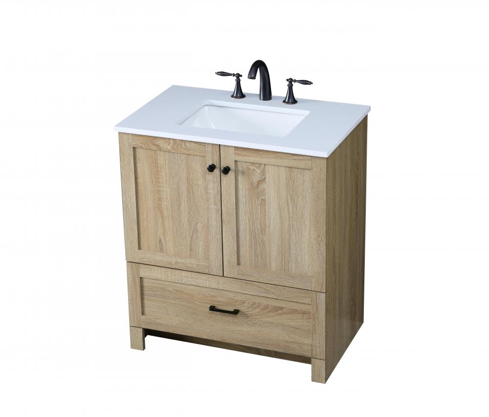 Revel in the beauty of a vanity that mimics the charm of real wood without the maintenance, boasting a faux wood look that adds a touch of natural warmth and rustic sophistication to your bathroom.