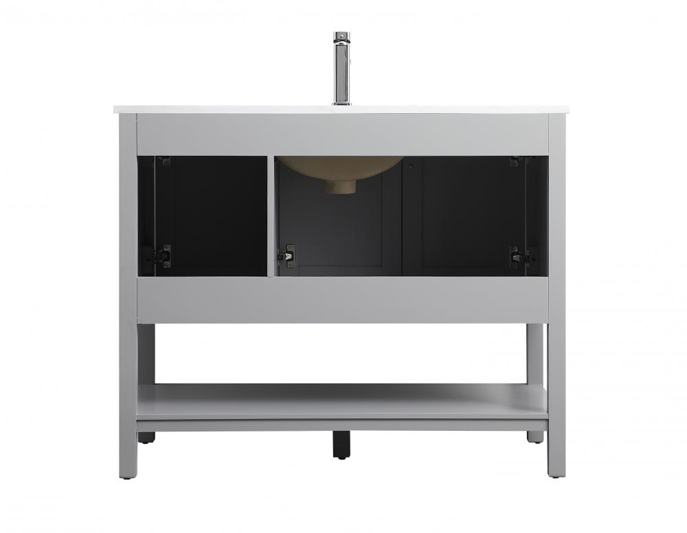 Boasting a lower open shelf for additional storage, this vanity offers a practical area to display decor or stow away essentials, seamlessly blending functionality with a touch of style for your bathroom.
