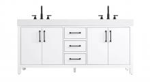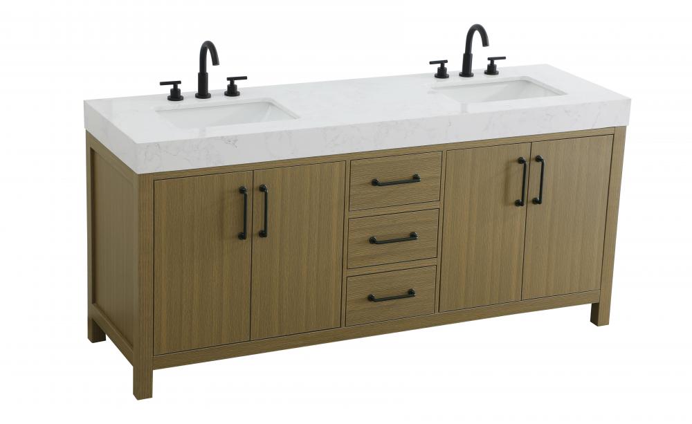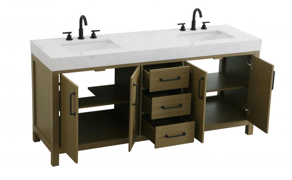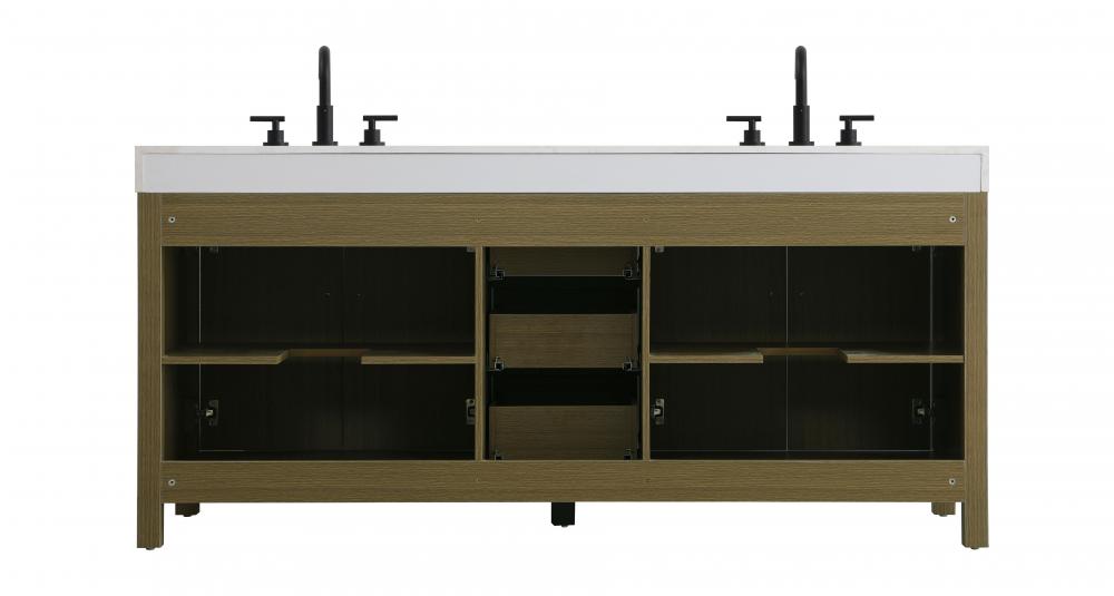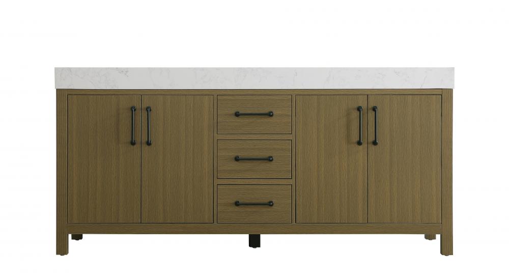 This bathroom vanity embodies a clean, minimalist design, perfectly suited for modern and transitional spaces. Its straight, sleek lines and flat-paneled doors create a refined yet approachable look. The warm, honey-toned finish highlights the subtle wood grain, adding visual interest while maintaining a sense of balance and simplicity. The design features a double-sink layout, emphasizing functionality and spaciousness, ideal for shared bathrooms. The central drawers and symmetrical cabinet doors create a sense of balance and structure. Matte black hardware offers a bold contrast to the warm wood tone, reinforcing the modern aesthetic while maintaining a timeless appeal. The thick engineered marble countertop adds a sturdy, minimalist element, with its clean white surface further elevating the overall sophistication of the vanity. This piece is a perfect marriage of style and practicality, effortlessly complementing both modern and transitional bathroom designs. This vanity is delivered fully assembled and equipped with foot levelers for effortless installation and stability. Combining practicality and bold design, this vanity is UPC certified and ready to transform your bathroom space.