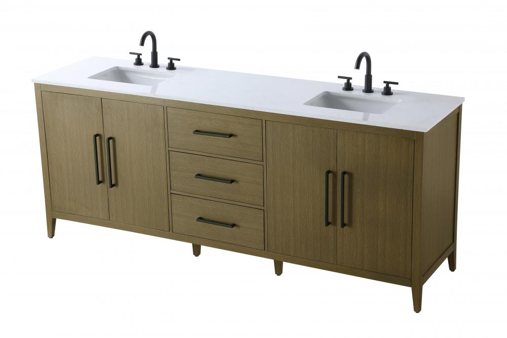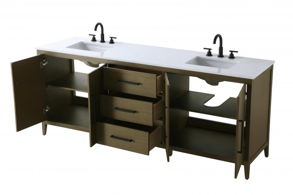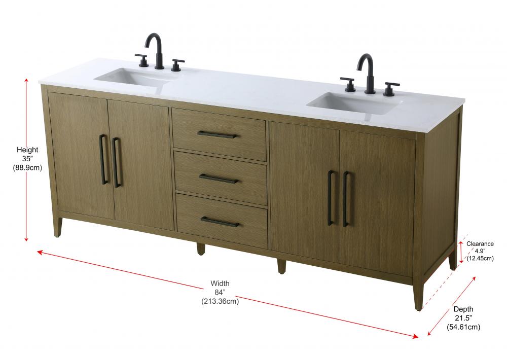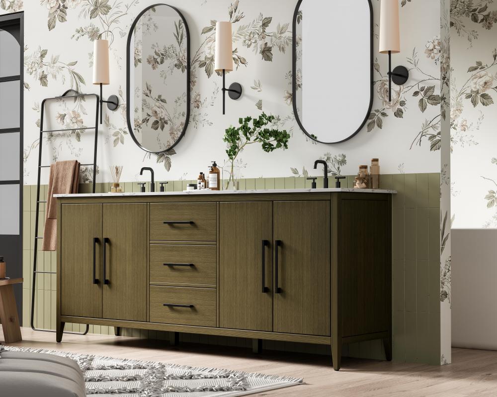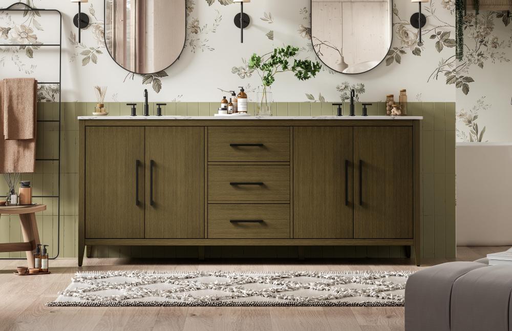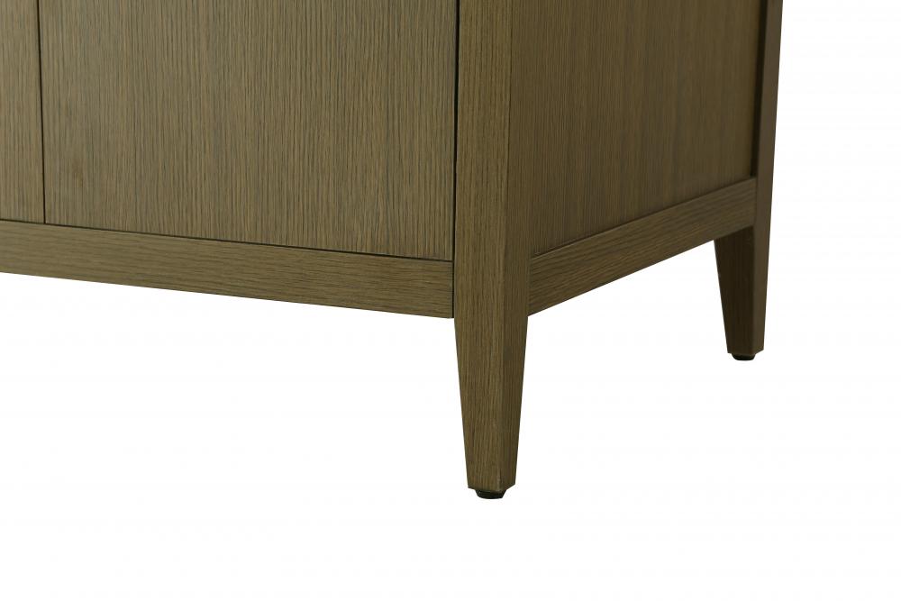 The vanity stands on tapered 5-inch solid wood legs with levelers for a balanced, polished look, combining modern style with practicality.