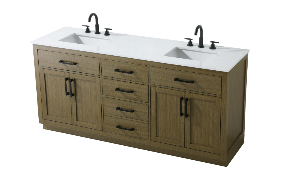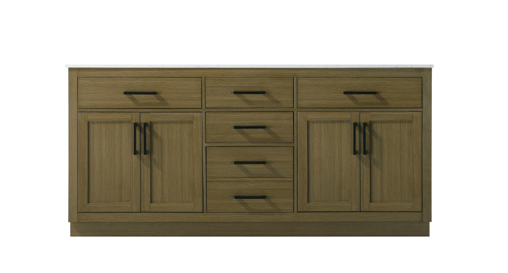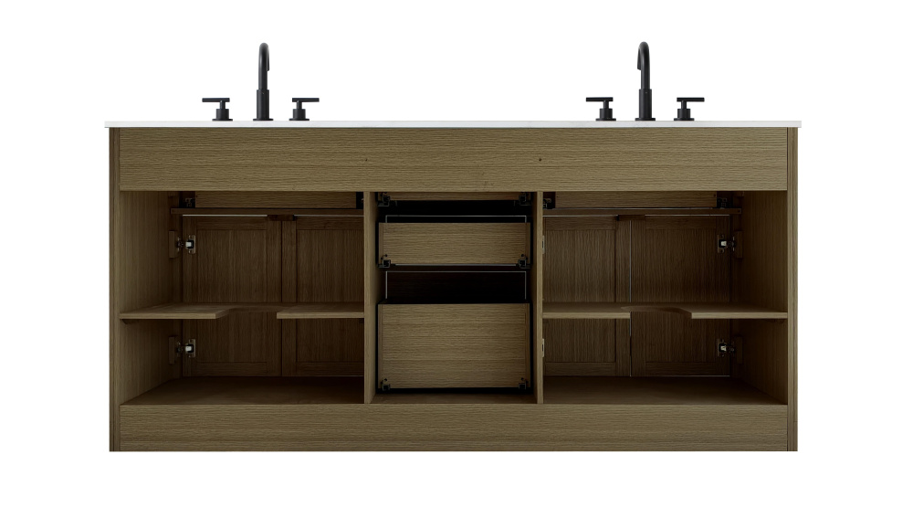 Introduce a perfect balance of functionality and style to your bathroom with this thoughtfully designed vanity. Constructed with a combination of solid wood and MDF, it offers durability and a sturdy build. The sleek engineered marble countertop with subtle grey marbling complements the rustic wood grain finish, creating a stylish and inviting centerpiece for your bathroom. Designed in a contemporary style with a transitional flair, it features a U-shaped shelf for seamless plumbing integration and multiple soft-close drawers for clutter-free organization. A pull-down drawer enhances convenience, while the toe kick adds a refined, clean-lined appearance and simplifies cleaning underneath. Matte black hardware contrasts beautifully with the cabinet finish, tying the look together. Delivered fully assembled and equipped with foot levelers, this vanity combines practicality and aesthetic appeal to suit modern and transitional bathrooms alike.