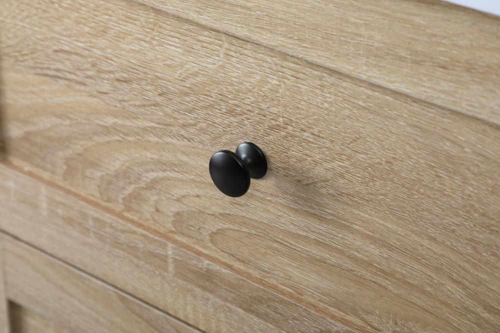 Experience the seamless and quiet operation of soft-closing five drawers and doors adorned with high-quality decorative knobs and slender bar pulls, adding a touch of sophistication.