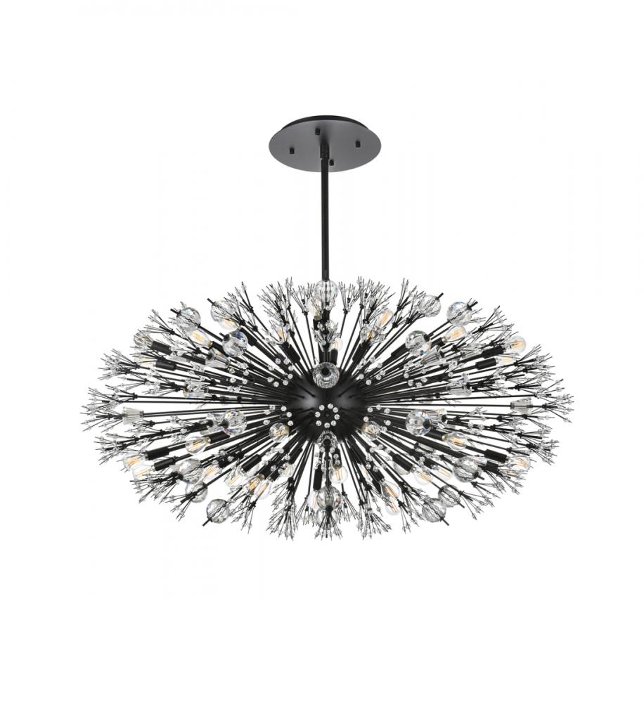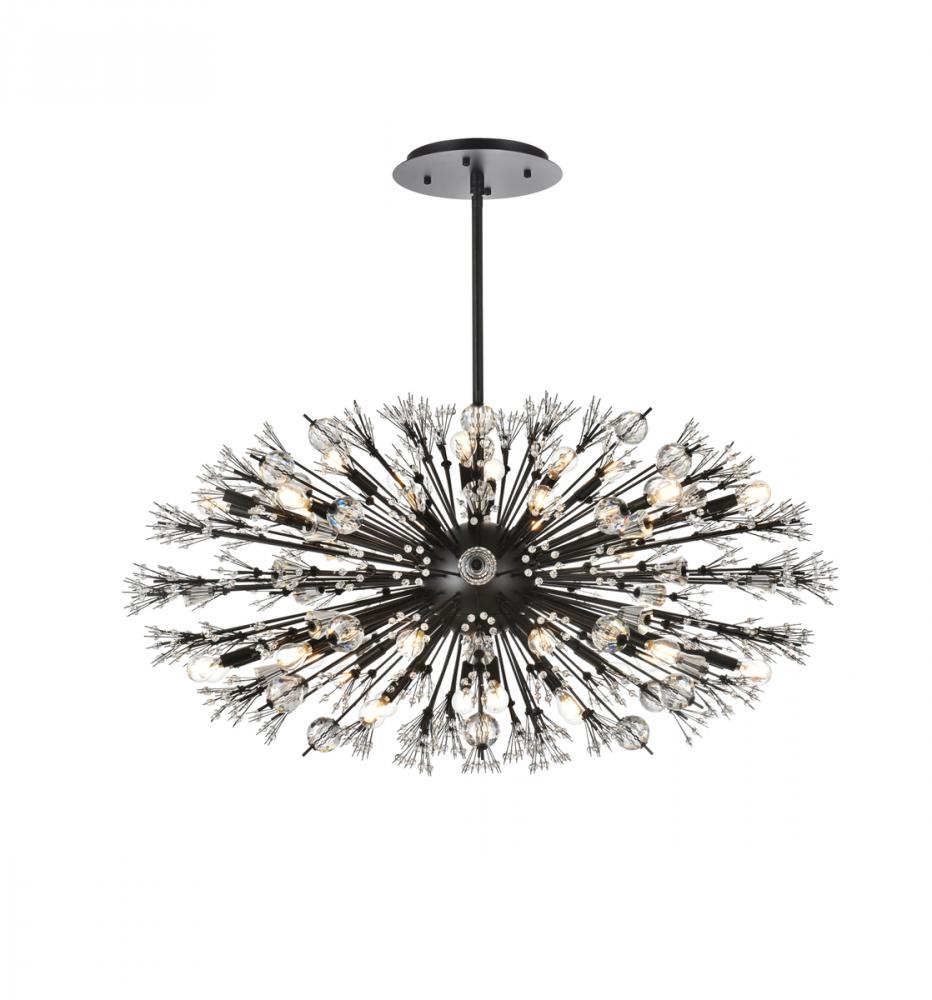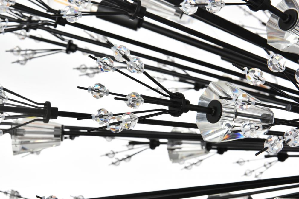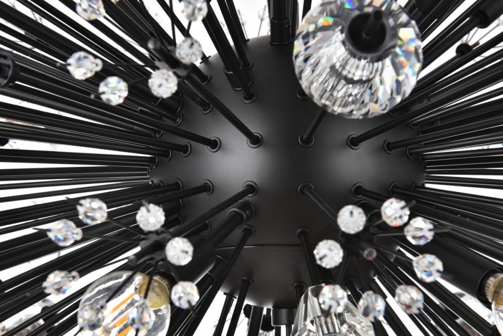 Like an explosion frozen in time, Vera collection hanging fixtures are suspended chaos. Clear large crystal balls and sprays of smaller crystals swirl amidst exposed candelabra bulbs (not included) balanced on dainty wires. A gleaming steel sphere forms the epicenter of the storm. A touch of savage beauty that easily compliments a kitchen, entryway, or bedroom. Sloped ceiling adaptable with a durable swivel could be mounted on vaulted or angled ceilings
