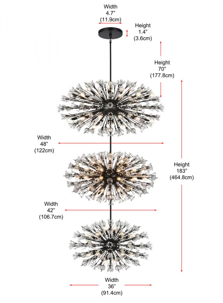 Like an explosion frozen in time, Vera collection hanging fixtures are suspended chaos. Clear large crystal balls and sprays of smaller crystals swirl amidst exposed candelabra bulbs (not included) balanced on dainty wires. A gleaming steel sphere forms the epicenter of the storm. A touch of savage beauty that easily compliments an entry or living room. Sloped ceiling adaptable with a durable swivel could be mounted on vaulted or angled ceilings. The length between each sphere can be configure to your needs as it comes with 70 inch long hanging rods. You can choose to hang the sphere from largest to smallest or vice versa.
