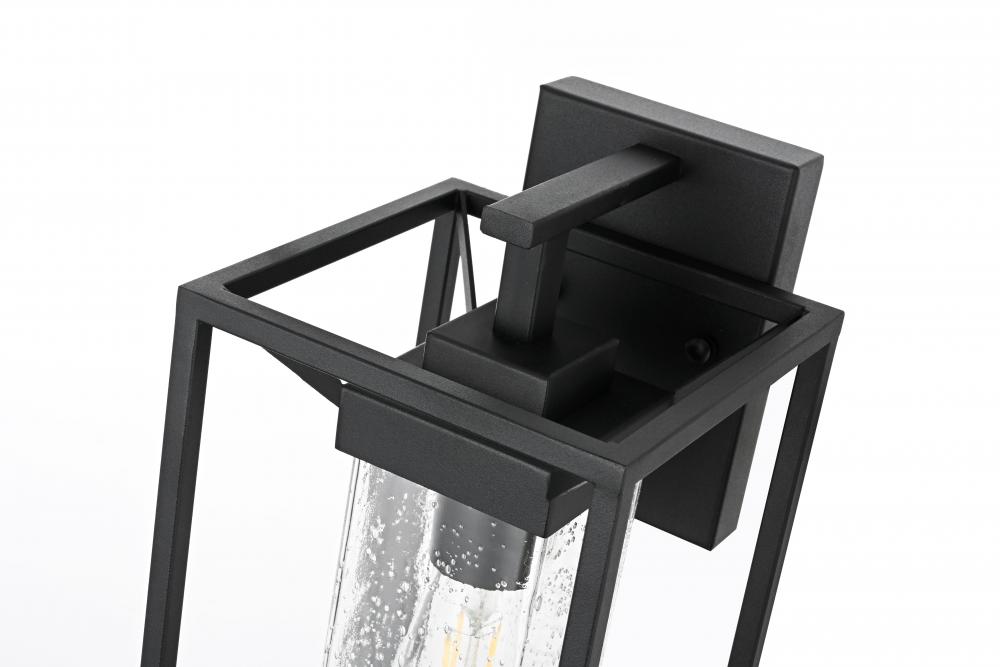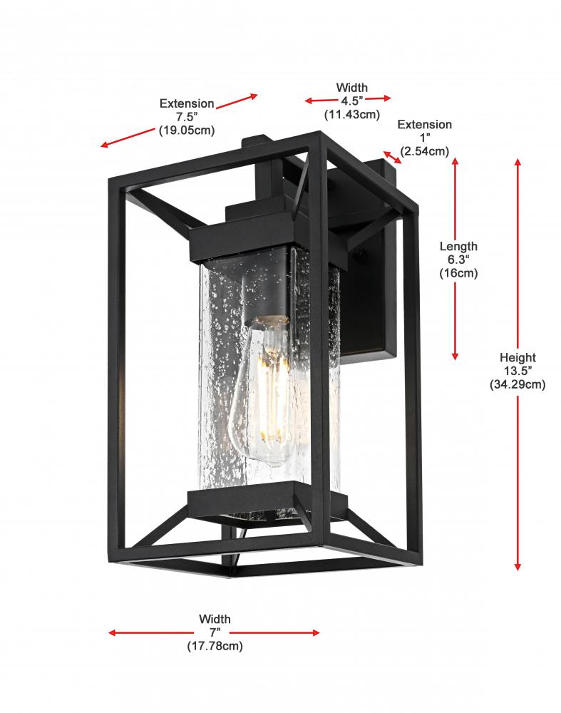 This outdoor wall sconce blends modern simplicity with timeless charm. The sturdy iron frame is designed in a geometric shape, beautifully housing the clear seeded glass that allows the warm glow of the light to shine through. The clear seeded glass adds texture to the illumination, creating an inviting and sophisticated glow that transforms the exterior of your home. with an E26 socket base that easily accommodates standard bulbs, this fixture not only provides style but also high functionality. Whether flanking your front door or lighting up your patio, this sconce elevates your outdoor space with a crisp, contemporary look that is both durable and refined.