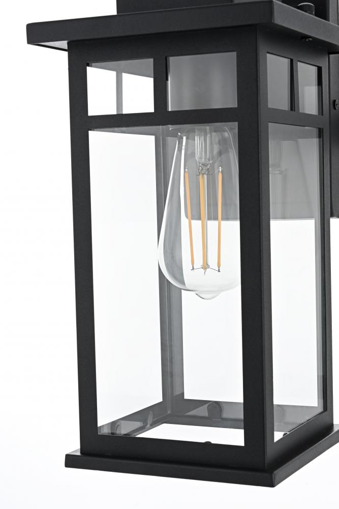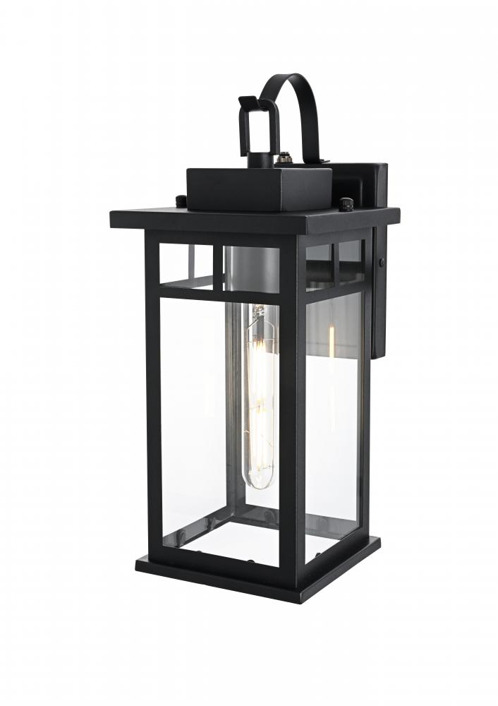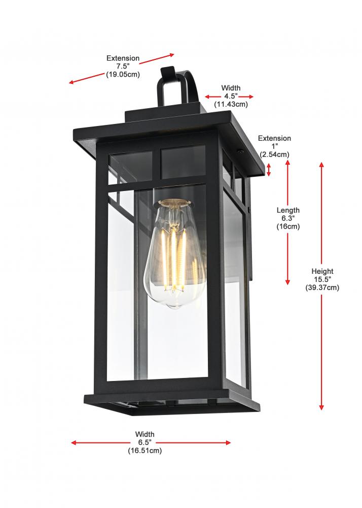 Enhance the curb appeal of your home with this sophisticated outdoor wall sconce. Featuring a sturdy iron frame in a rich matte black finish, this fixture offers a perfect combination of modern aesthetics and traditional charm. Clear glass panels allow for a bright, ambient glow, beautifully showcasing any decorative bulb you choose. with its built-in dusk-to-dawn sensor, you can enjoy automatic lighting that adds both convenience and energy efficiency to your outdoor space. The timeless lantern design complements a wide range of architectural styles while ensuring lasting durability against the elements. Whether it's your front porch, back patio, or any outdoor area, this wall sconce effortlessly blends style with functionality.