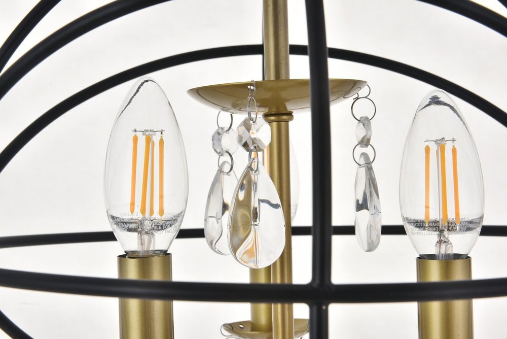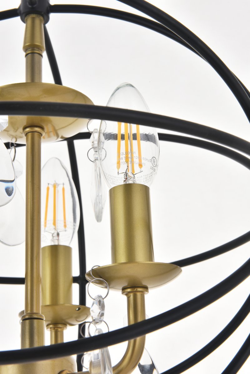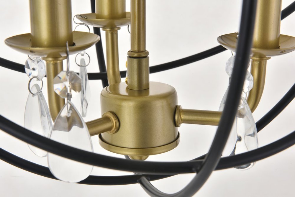Two-toned brass and black finish open gyroscopic frame with suspended crystals hanging from the bobeche, offering a stylish old world charm