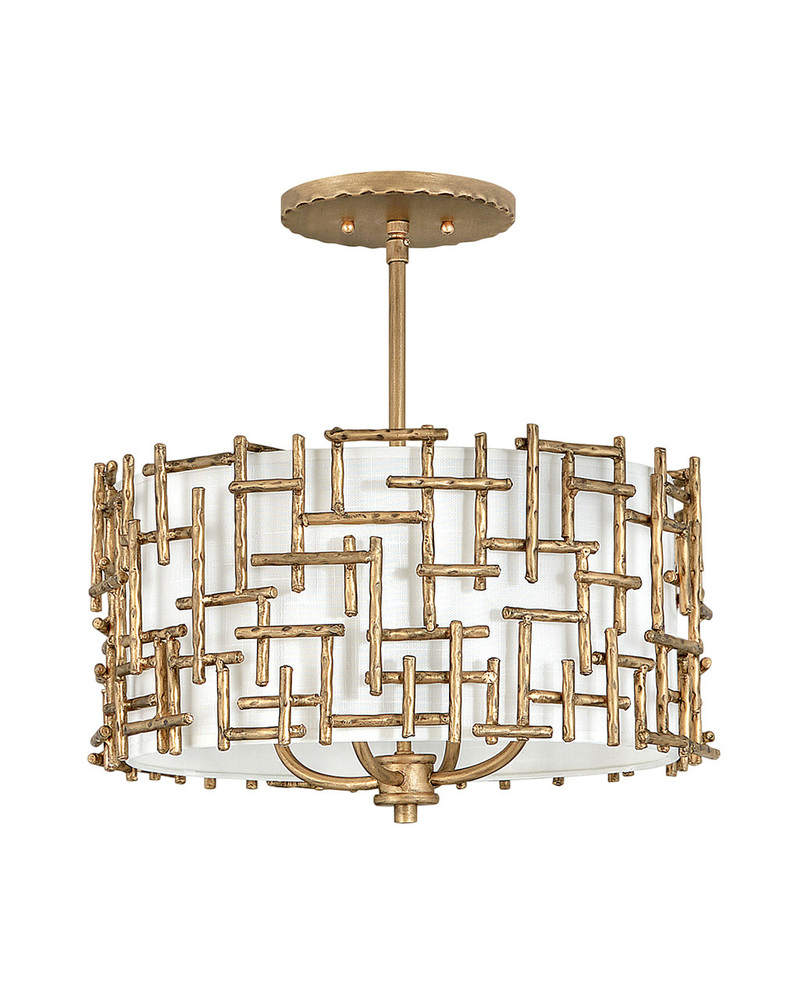 Farrah's contemporary design is bold and sculptural, while achieving an optical airiness. The hand-hammered crosshatch bars gleam in a hand-applied Silver Leaf or Burnished Gold finish with artisanal detailing that carries through to the canopy detail. Set against a White Linen shade, Farrah creates a look of deconstructed; modern elegance.