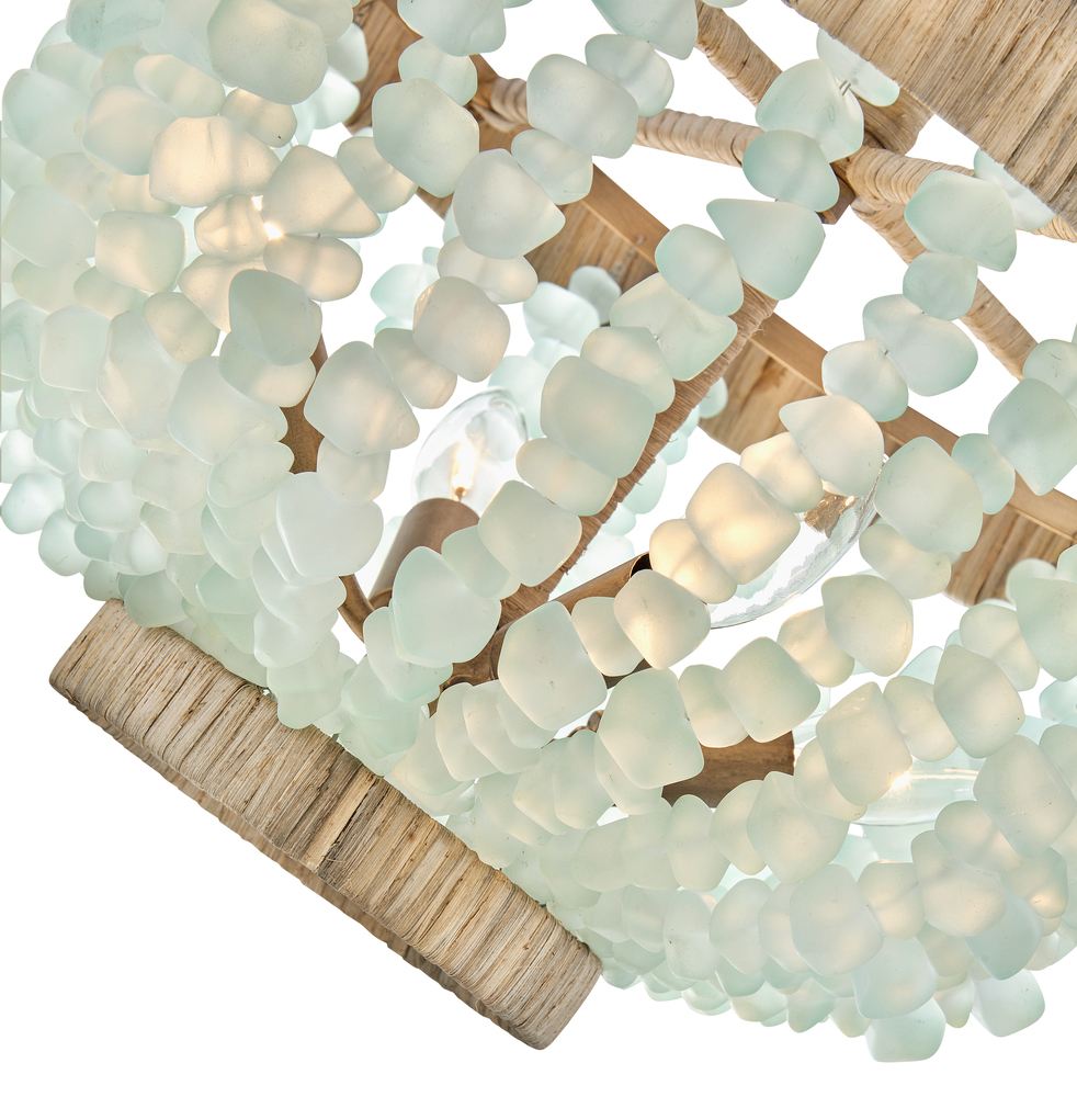 Dune's bohemian chic design showcases strands of soft sea glass combined with a Burnished Gold finish. The designs blend a sophisticated silhouette with organic elements inspired by sun and surf. Dune infuses any space with timeless, mesmerizing elegance.