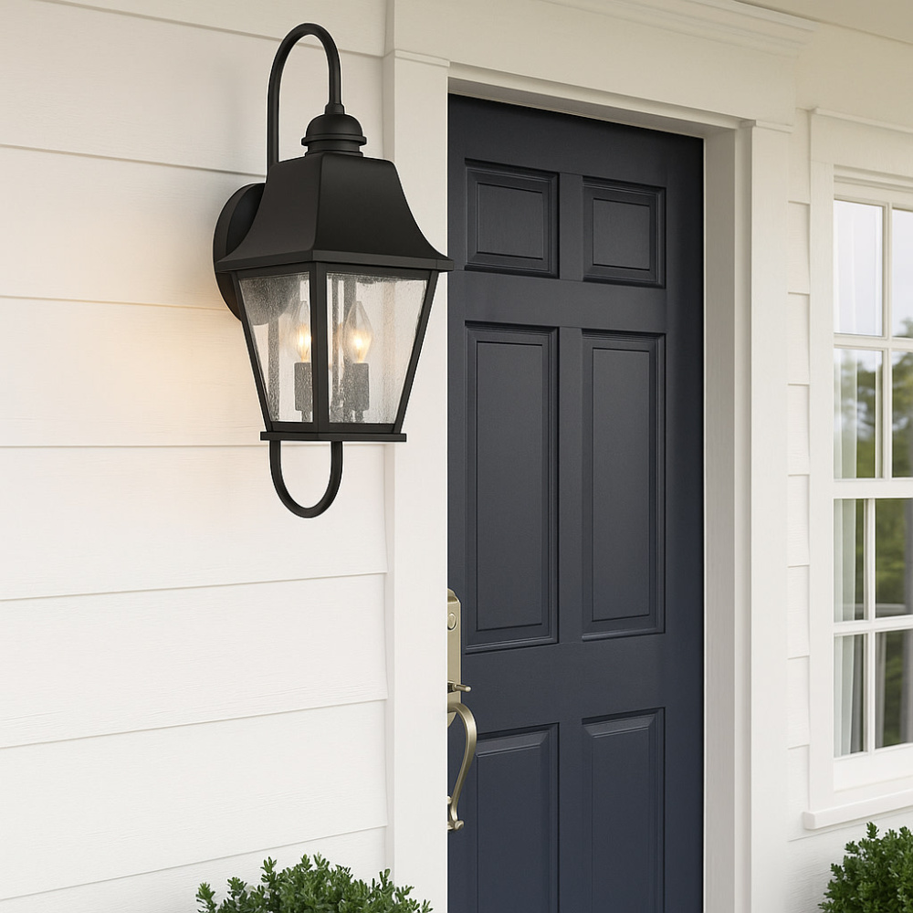 Effortlessly elegant, Kingston embraces traditional features and visual intrigue to illuminate exterior spaces, while its sturdy aluminum construction ensures durability to withstand outdoor elements. The classic lantern design highlights an oversized soft sweeping roof and bottom arm, clean lines, and a Black finish. Kingston's removable hood allows for easy bulb replacement.