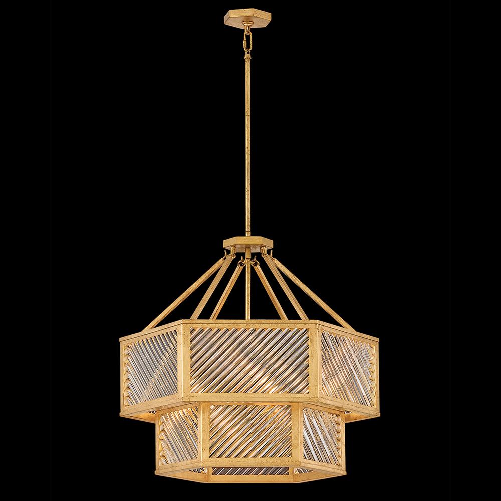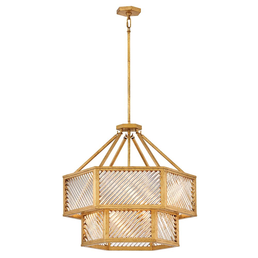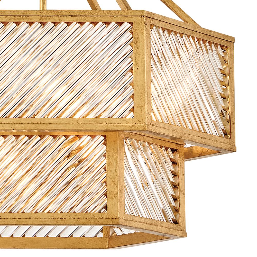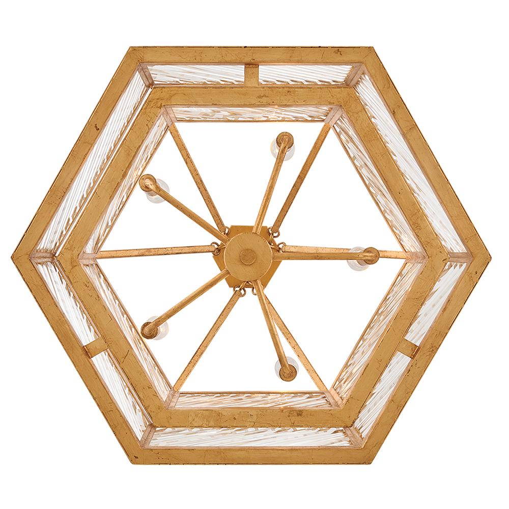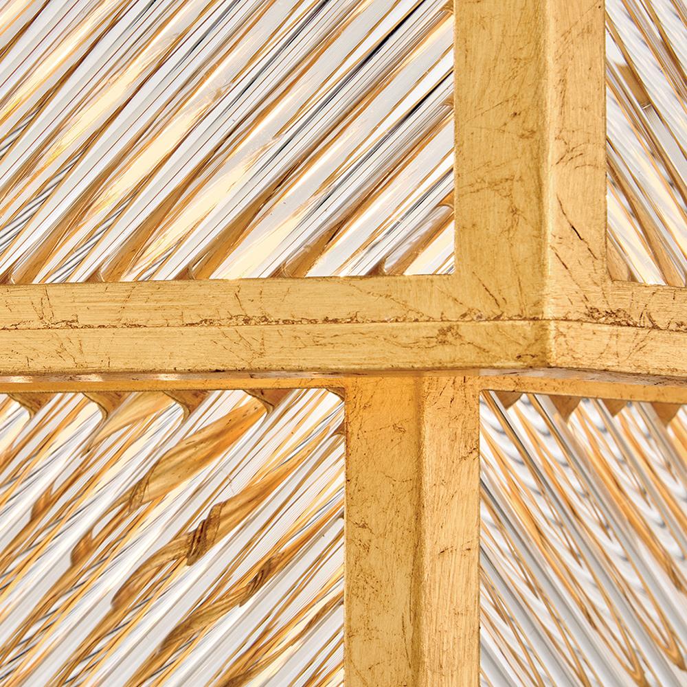 A reimagining of vintage designs from the 40s and 50s, Sura’s transitional, hexagonal Distressed Brass frame creates a glamorous yet understated and tailored appeal. Cylindrical glass rods set at alternating angles echo a soft herringbone pattern, juxtaposing geometry within geometry. Layered details create a reeded effect that is reflective and alluring.