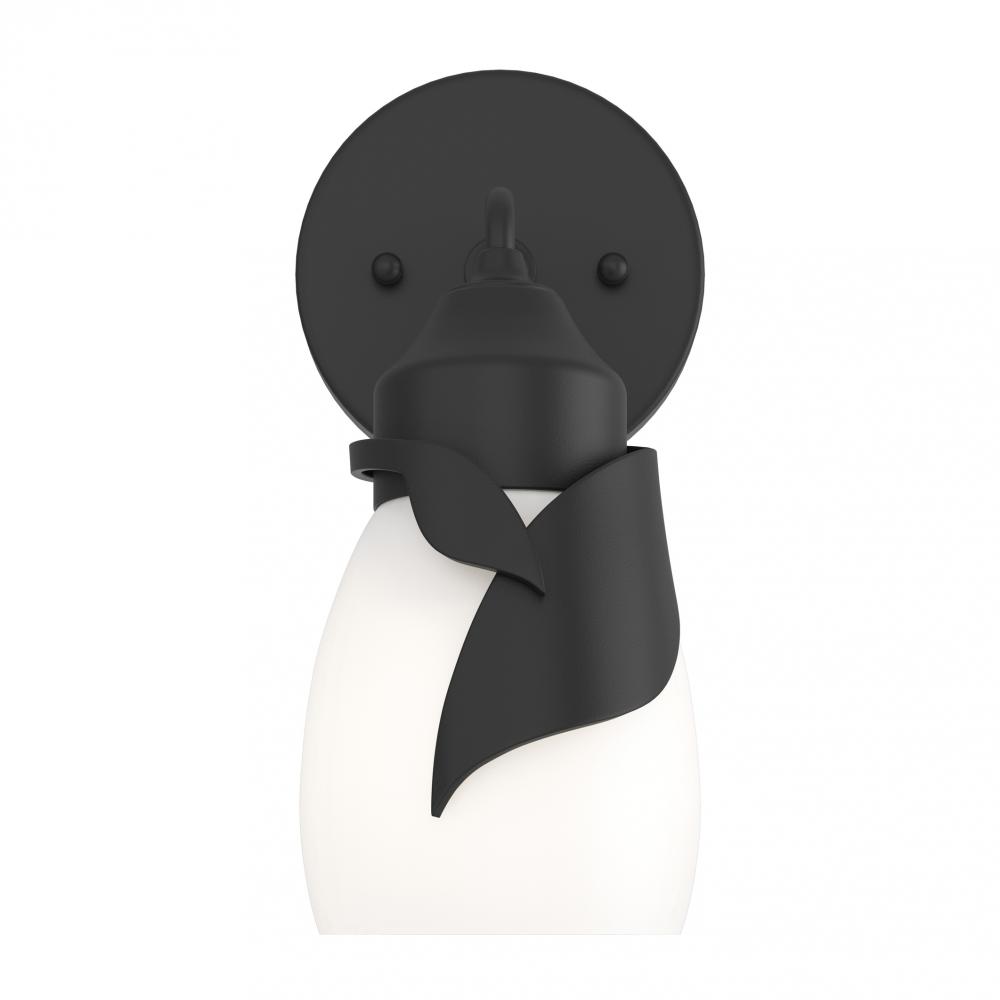 Able to be positioned for up- or downlight, the Lapas 1-Light Bath Sconce features a large and a small stylized leaf that embrace the glass shade. A single metal arm is angled from its small round backplate. Available in Black, Oil Rubbed Bronze, Vintage Platinum, Soft Gold, Sterling and Modern Brass.