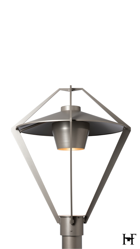Enclosed in a stunning metal exoskeleton for a minimalist contemporary take on a classic lantern design, this Dark Sky Friendly post light offers a sophisticated welcome to visitors. Its airy, open "cage" contains a short metal cylinder from which the light emanates. By focusing the light downward, light pollution is reduced and the effective lighting helps to increase path safety.