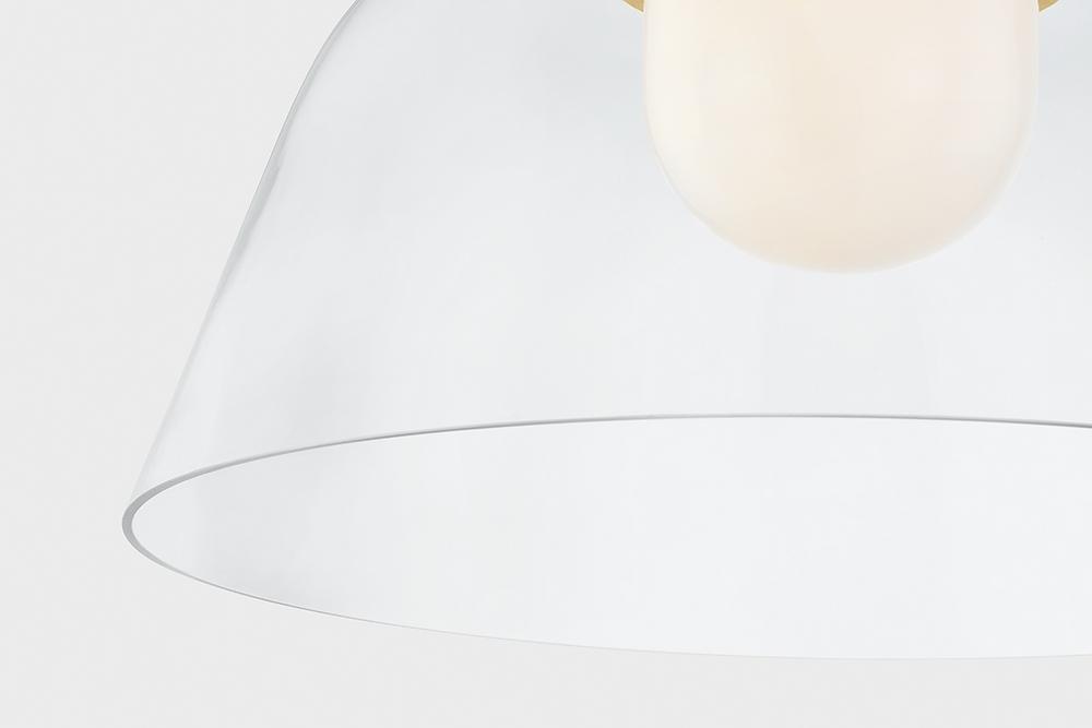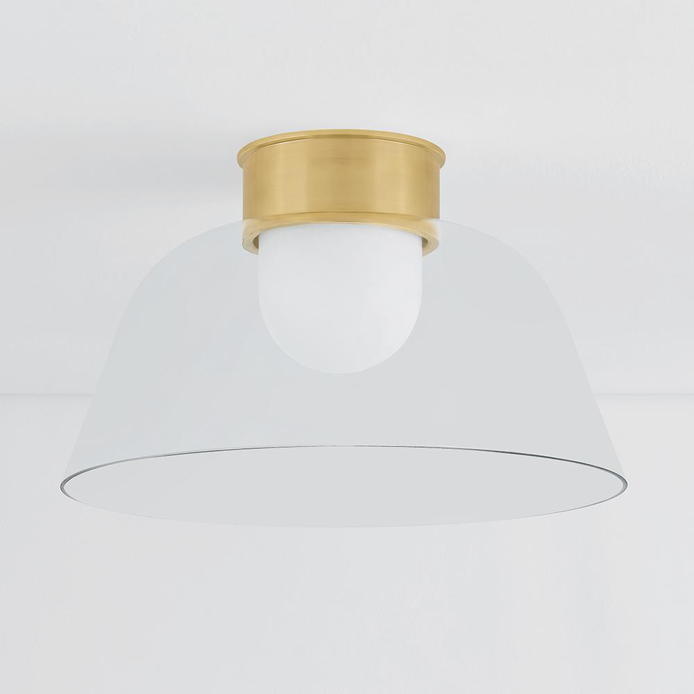 A celebration of the beauty of pared-down forms, Lakeside features an opal glossy inner diffuser surrounded by a clear outer glass layer. Shaped like a graceful bowl, this flush mount forgoes ornamentation save for its extra-tall metal canopy. Available in Aged Brass or Distressed Bronze finishes, the streamlined metalwork adds a decorative note to the minimalistic design.