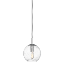 Thick mouth-blown glass with a discrete pattern of bubbles domes around a warm incandescent bulb. At its base, the globe has an opening, which allows you to manually change the bulb. Smooth woven cords add an urbane touch. Exciting options in our Rousseau family include several fun colors and the choice between hanging a single pendant or a staggered cluster.
