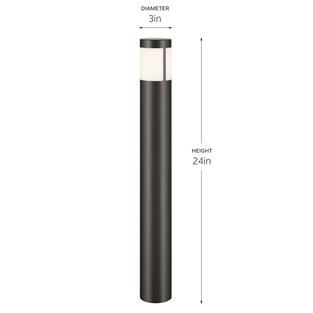 Illuminate outdoor spaces with the 12 Volt LED 24" tall Round Bollard in Textured Architectural Bronze. Designed to take on the elements of the outdoors, the Round Bollard offers a 2700K integrated LED light source that, delivers a warm white light to sidewalks, stone pathways and walkways. Its form meets function with electrical components that are fully sealed using a ribbed gasket which provides an even, watertight seal to the lens. It also features a streamlined, clean modern design to coordinate with a wide variety of exterior home styles.