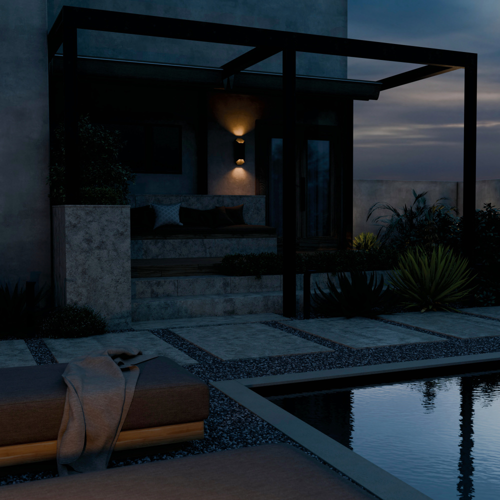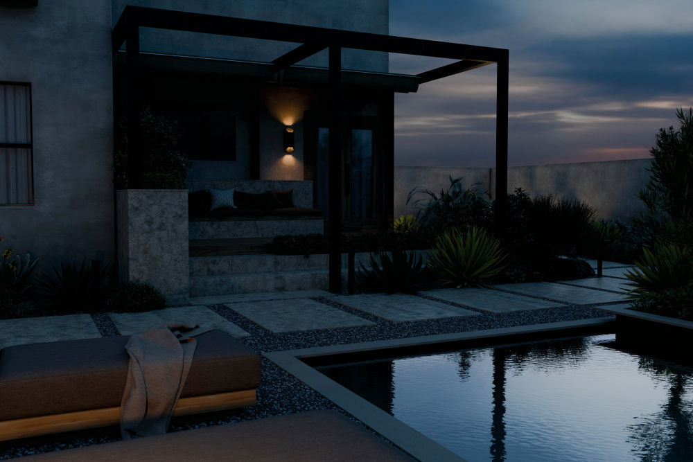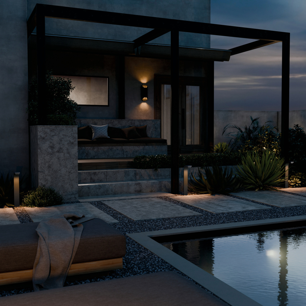 Its contemporary design blends seamlessly with nature while spotlighting the surrounding exterior style