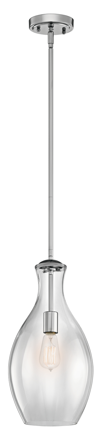 The Everly™ 17.75" one light hour glass shaped pendant comes with a curved, glass blown container featuring clear glass and a Chrome finish for a simple and elegant look. The Everly's versatile design coordinates with a variety of styles and can be used singularly, in multiples or arranged at varying heights to elevate the room.