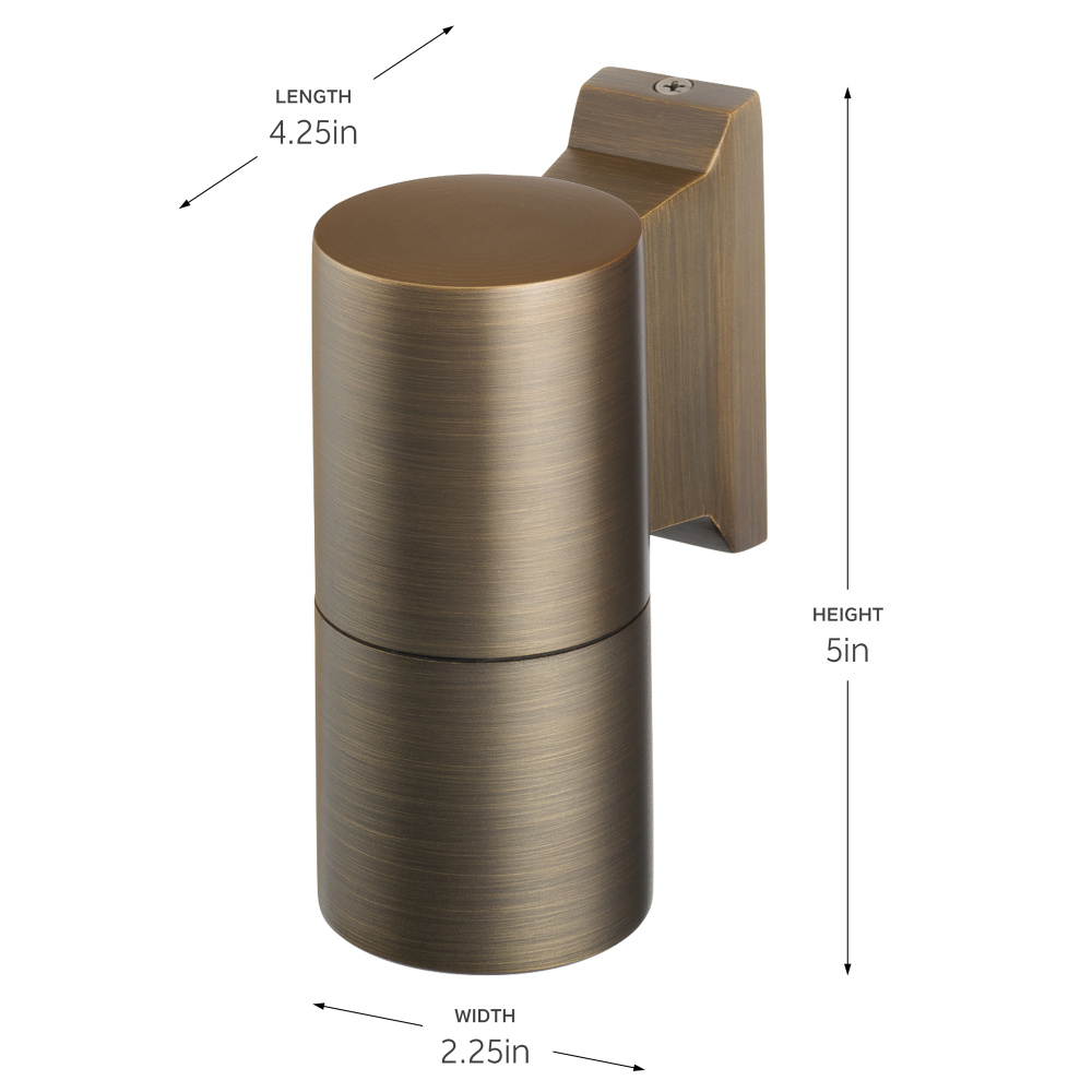 Elevate your outdoor lighting with the elegance, functionality, and resilience of the small downlight sconce. Constructed from solid, cast brass, this fixture is designed to withstand harsh weather and coastal conditions all year round. Its threaded and sealed construction protects against water ingress. As versatile as it is practical, the sconce's single downward facing MR16 Bi-Pin socket lamp base is optimized for Kichler LED drop-in lamps, providing easy installation and light output. Its reduced-size mounting bracket and hardware allow for clean, precise installations on narrow beams, rails, and posts”ideal for pool cages and screen room enclosures. Featuring a downward-pointing MR16 lamp, this sconce offers gentle illumination of seating areas or pool decks.