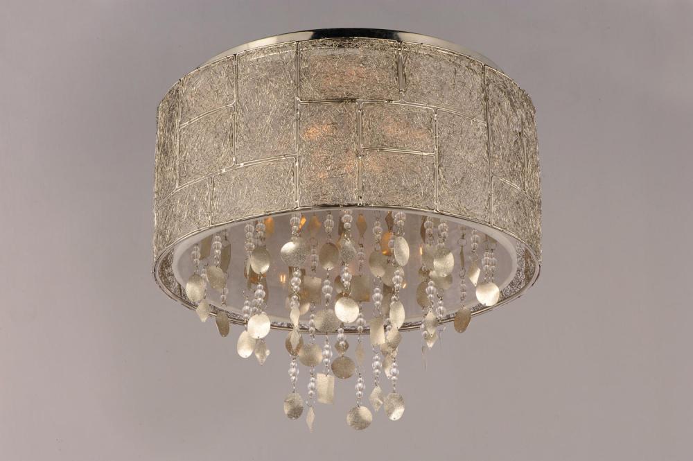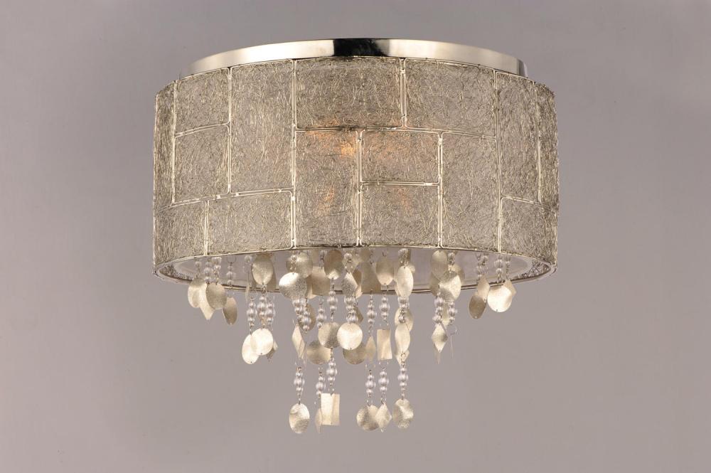 Hand formed panels of Polished Nickel wire are braised together to form unique shades. Shades are lined with a Twilight fabric, adding a sparkle effect. Strands of jewelry-grade lures with Clear glass beads add an eclectic accent.