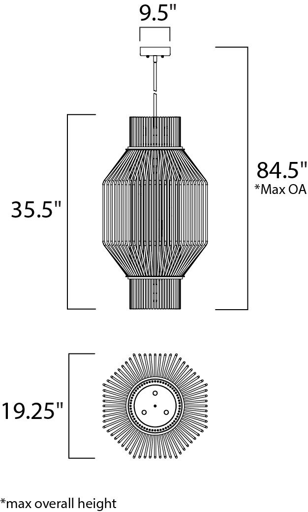Heavy weight steel cages support a circular band of individual glass rods which run beyond the entire height of the fixtures. A spiraling cluster of G9 LED bulbs refract light in an unusual pattern creating a lighting effect sure to create attention. You