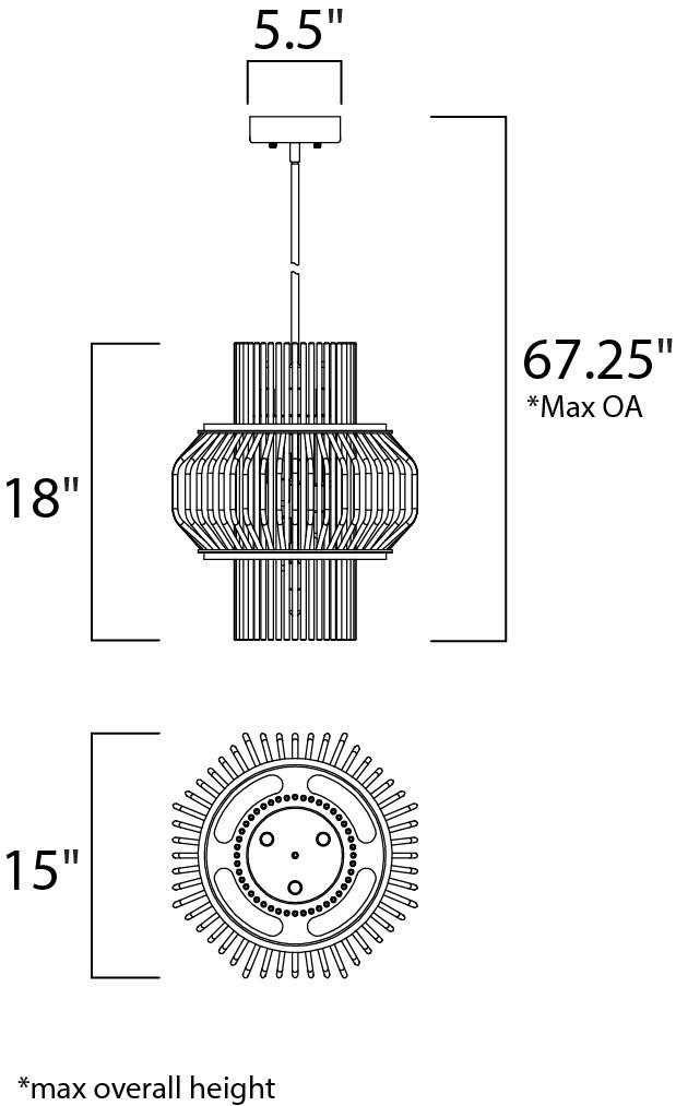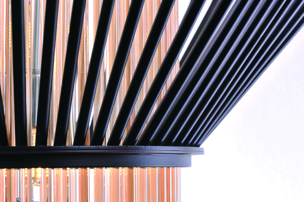 Heavy weight steel cages support a circular band of individual glass rods which run beyond the entire height of the fixtures. A spiraling cluster of G9 LED bulbs refract light in an unusual pattern creating a lighting effect sure to create attention. You