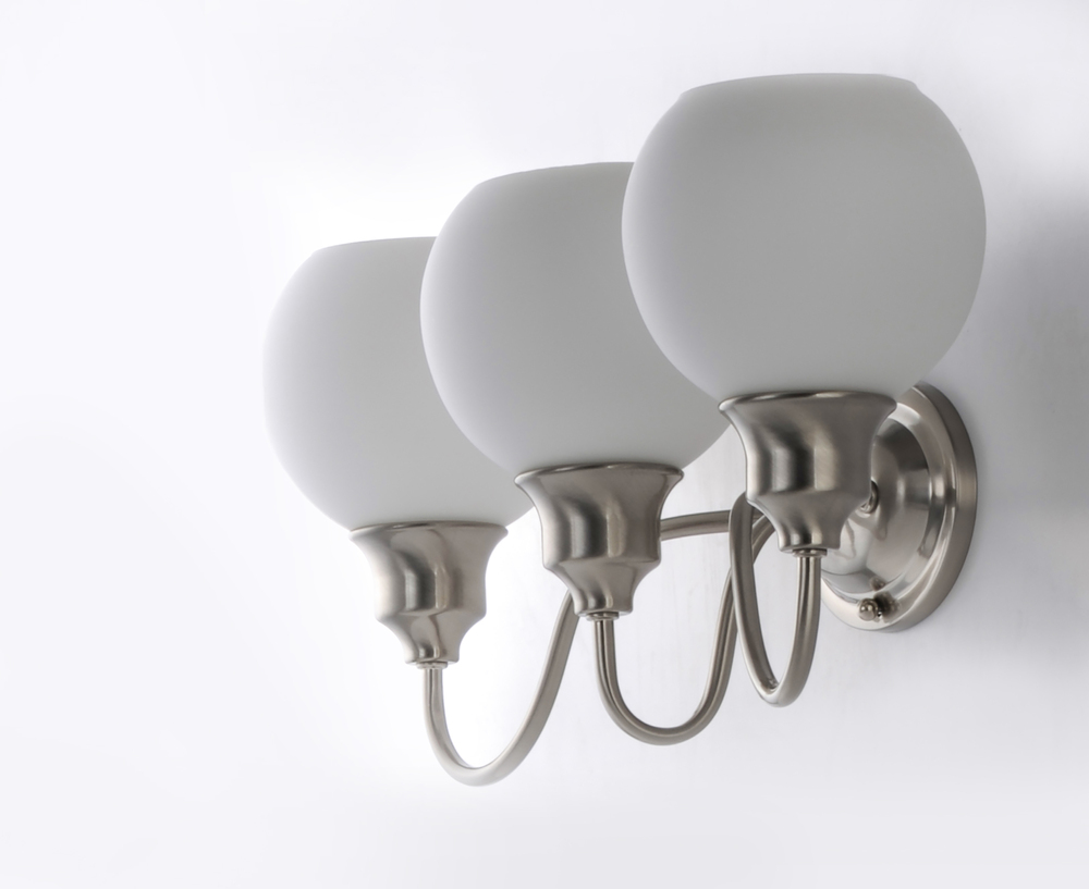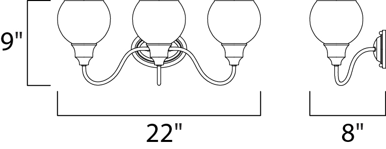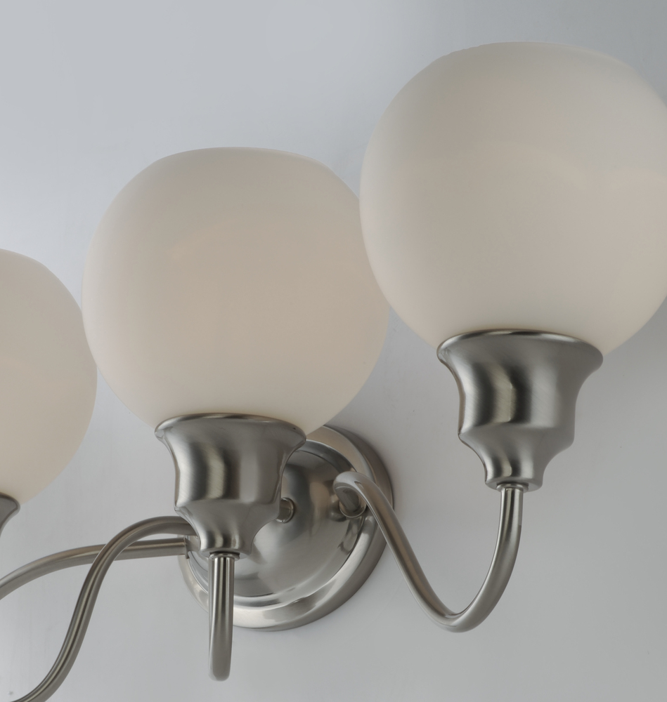 Curved arms support circular glass with an open bottom which can be installed facing up or down. Available in your choice of Polished Chrome with Clear glass or Satin Nickel with Satin White glass.