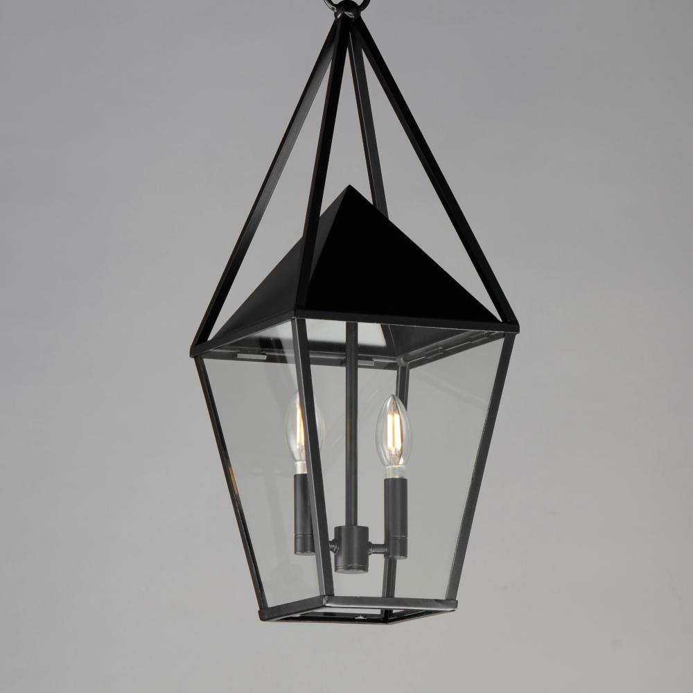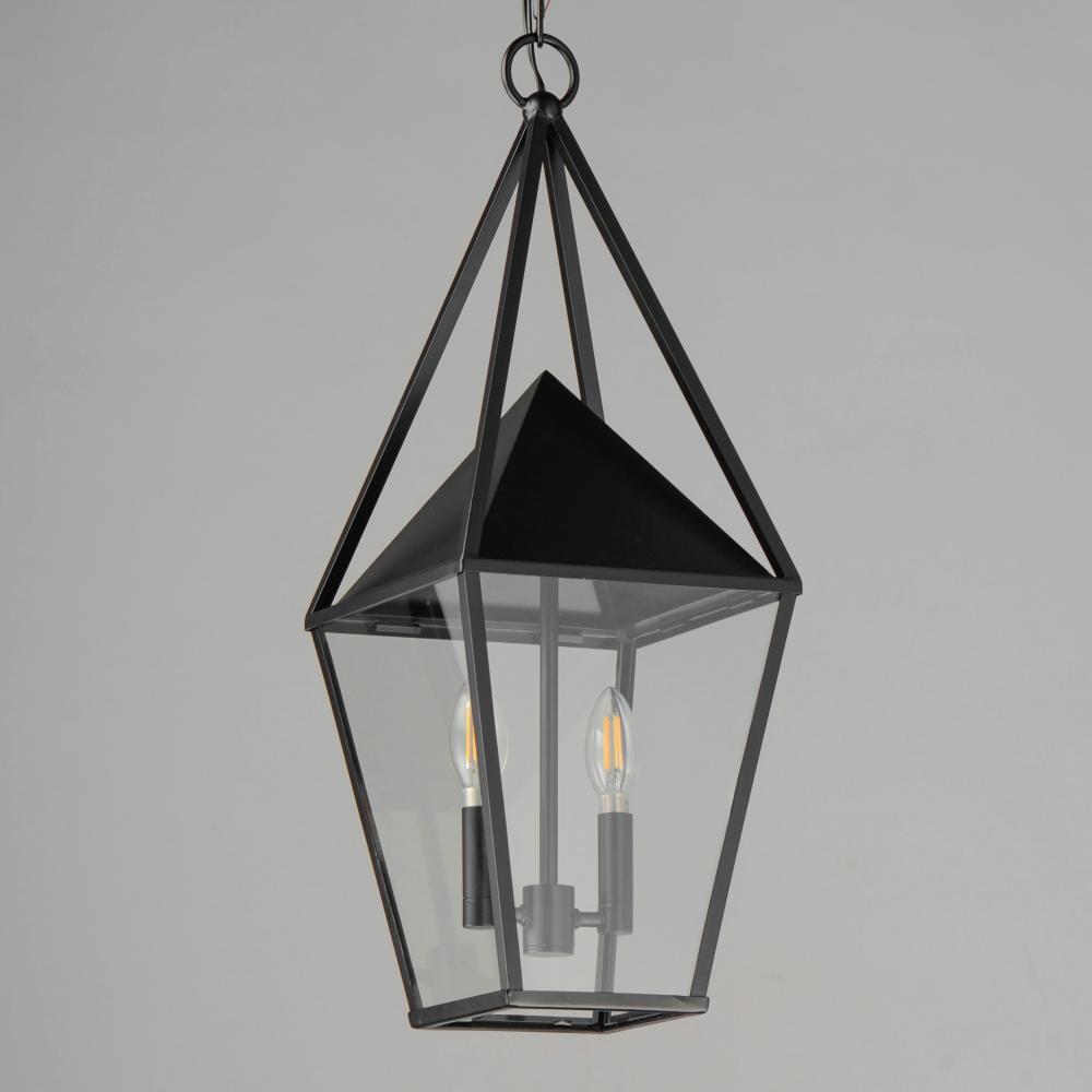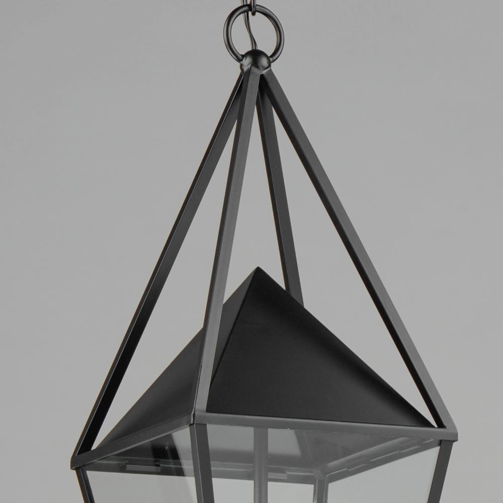 An exaggerated openwork framed steeple adds vertical qualities on a sharp-lined Matte Black lantern frame. Blending modern concepts with forms that evoke a whimsical imagery, this collection presents a transitional styling for outdoor spaces.