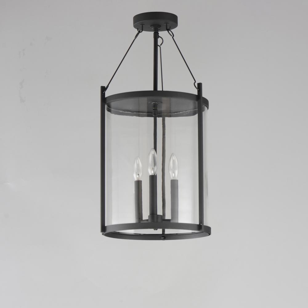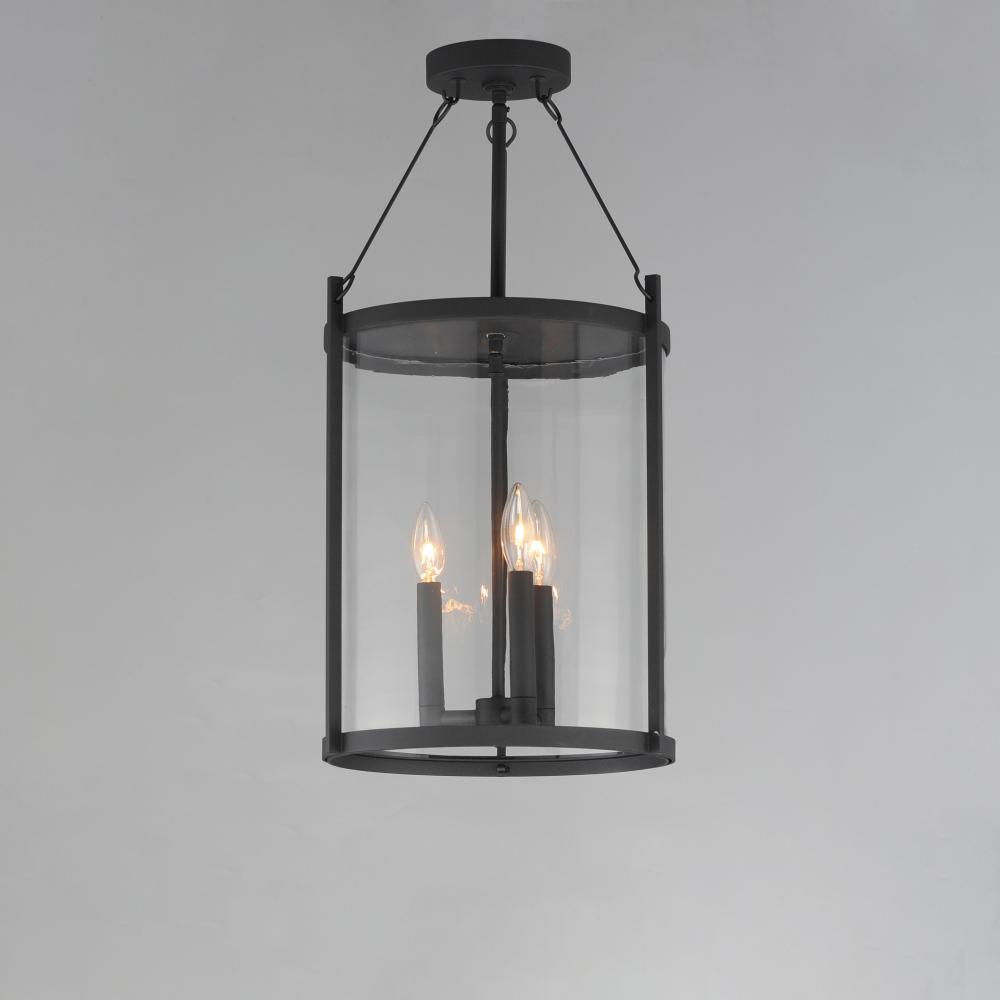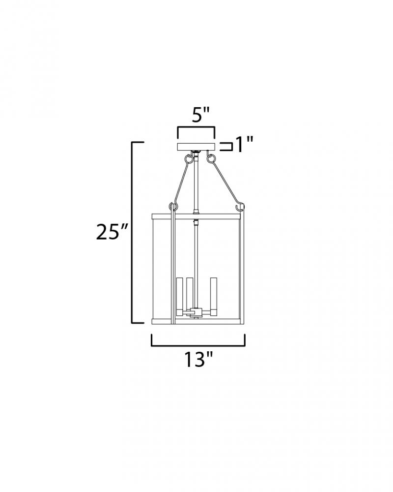Squared columns in Matte Black finish tower above the cylindrical glass shade rated for outdoor applications. Available in a more modern clear glass option or hammered glass. A rectangular hook detail carries the square form through to the backplate. A mod