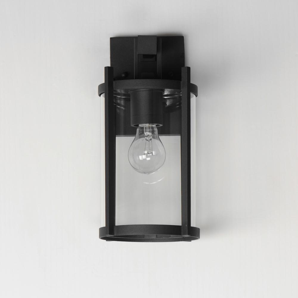Squared columns in Matte Black finish tower above the cylindrical glass shade rated for outdoor applications. Available in a more modern clear glass option or hammered glass. A rectangular hook detail carries the square form through to the backplate. A mod