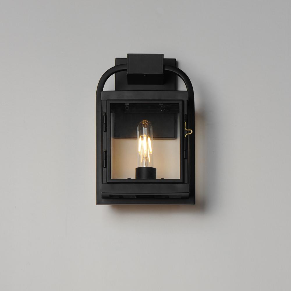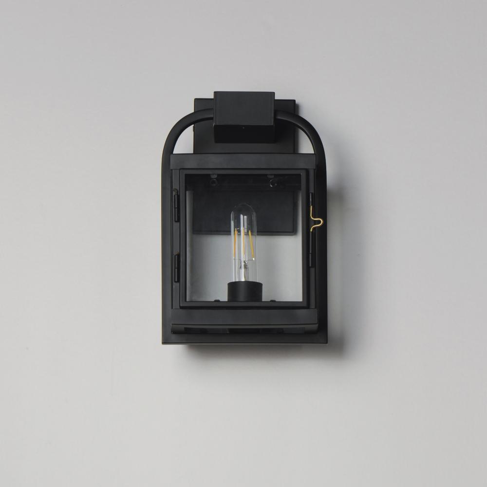 Inspired by classic English lantern design, this collection of outdoor sconces have been streamlined for modern appeal. A convenient, and quaint front door latch allows you to clean and maintain the fixture. Finished in a clean, Matte Black finish with bra