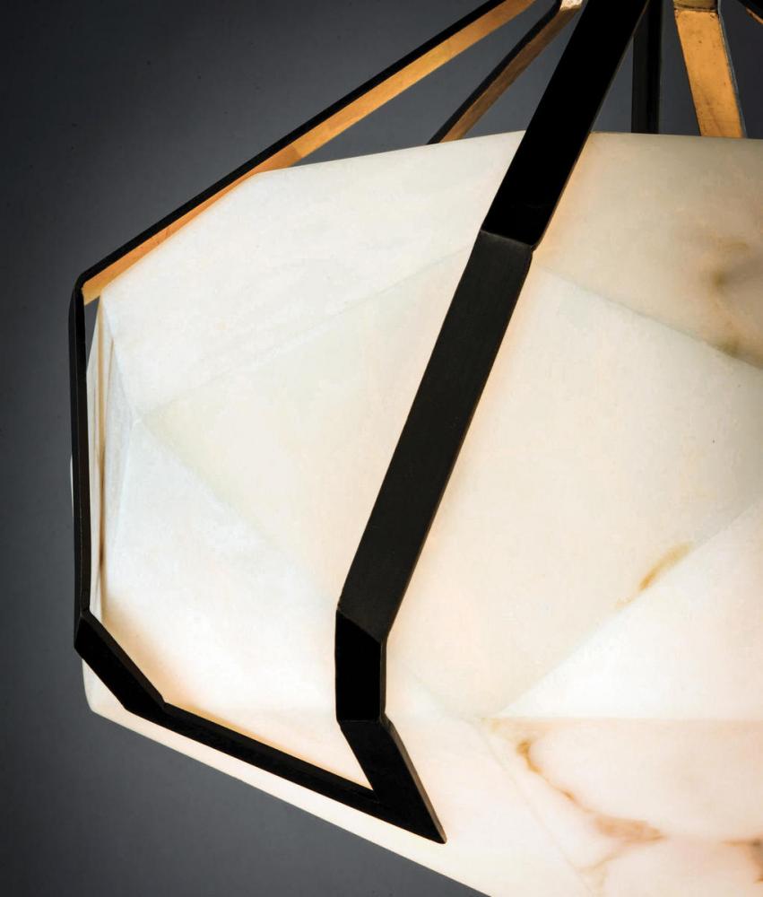 Hand formed faceted spheres of faux Alabaster are cradled by metal frames finished in Bronze Gilt and Gold Leaf interior. These contemporary forms are illuminated by high powered LEDs to enhance the beauty of the marble and provide ample light.