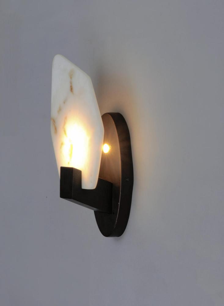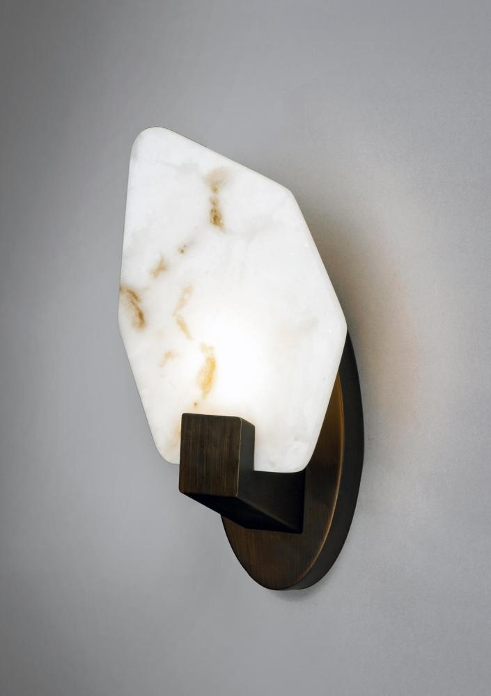 Hand formed faceted spheres of faux Alabaster are cradled by metal frames finished in Bronze Gilt and Gold Leaf interior. These contemporary forms are illuminated by high powered LEDs to enhance the beauty of the marble and provide ample light.