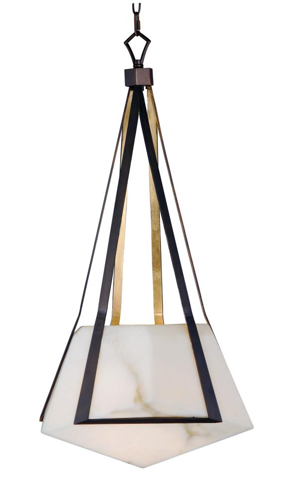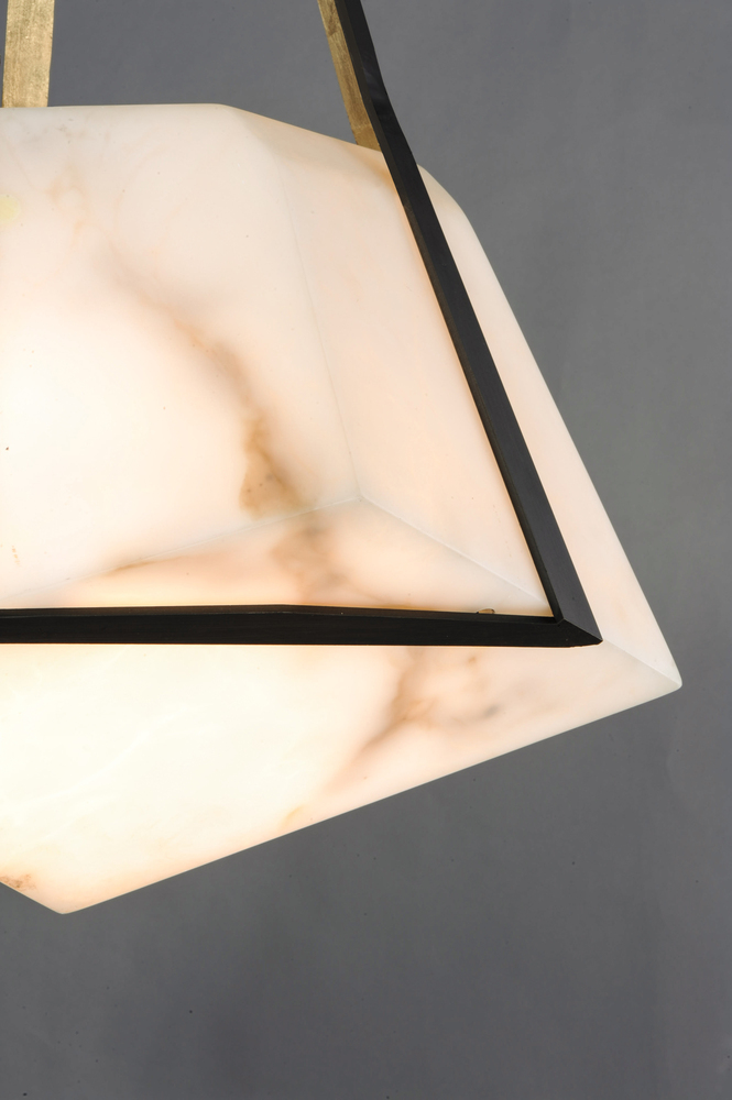 Hand formed faceted spheres of faux Alabaster are cradled by metal frames finished in Bronze Gilt and Gold Leaf interior. These contemporary forms are illuminated by high powered LEDs to enhance the beauty of the marble and provide ample light.